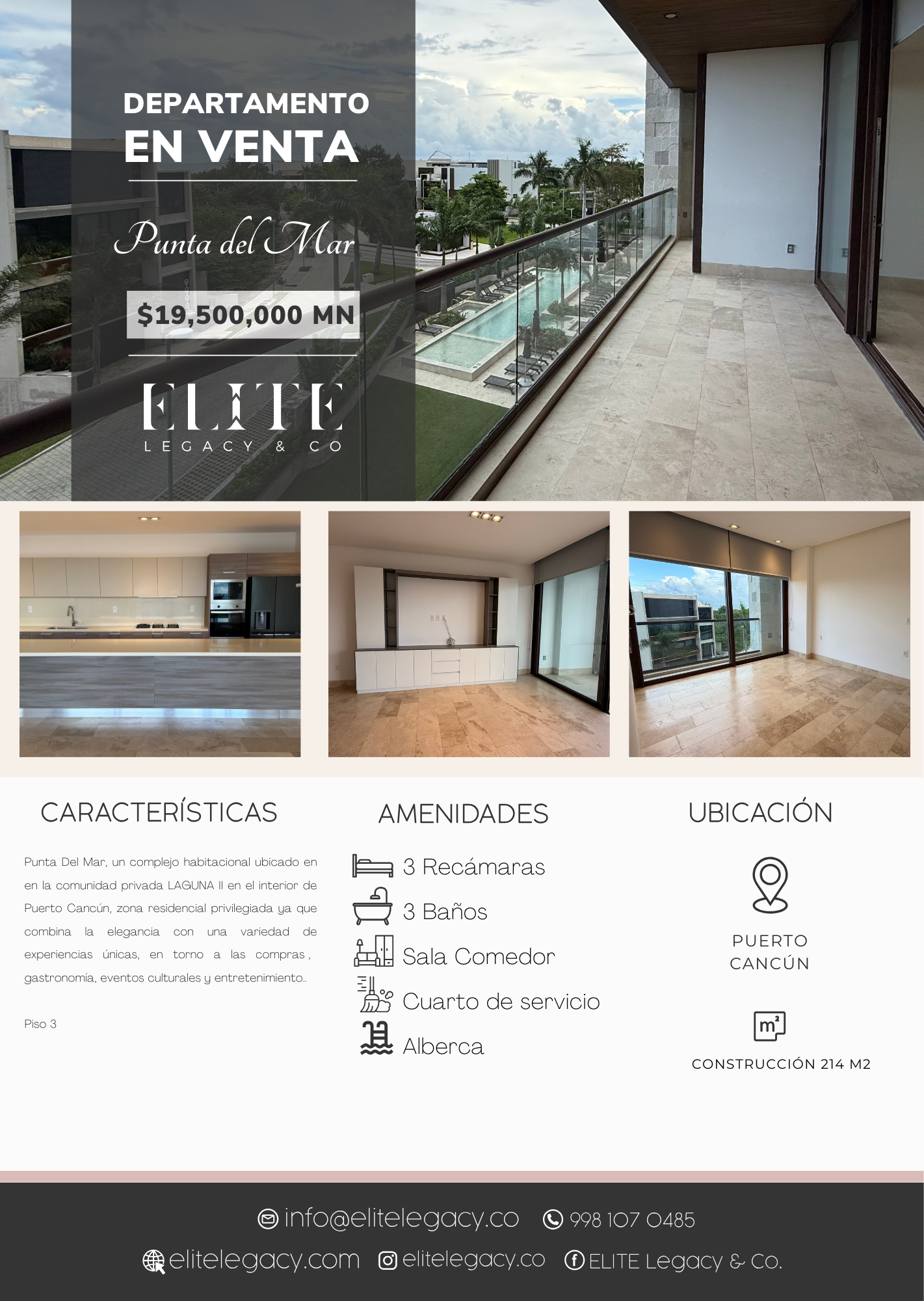 Punta Del Mar, un complejo habitacional ubicado en en la comunidad privada LAGUNA II en el interior de Puerto Cancún, zona residencial privilegiada ya que combina la elegancia con una variedad de experiencias únicas, en torno a las compras , gastronomía, eventos culturales y entretenimiento.