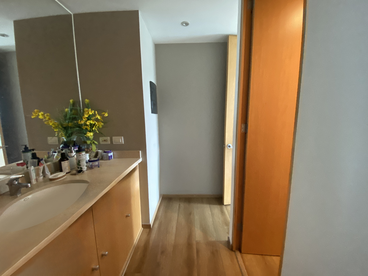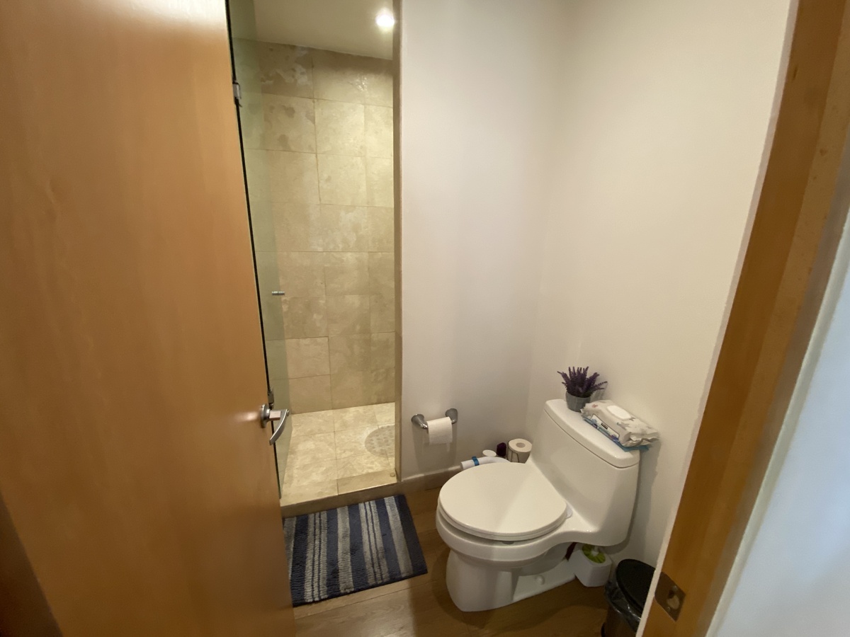Pisos de duela de ingeniería, acabados finos, baño con mármol y cancel de vidrio templado.