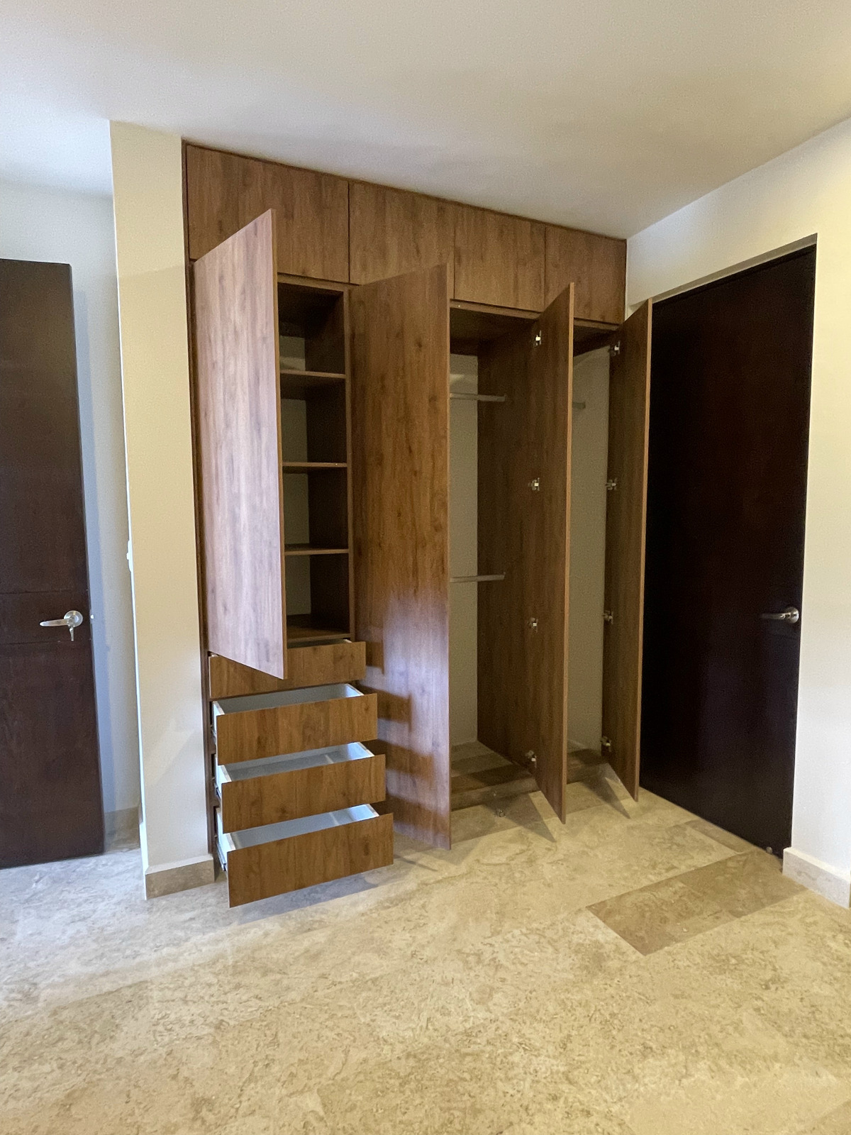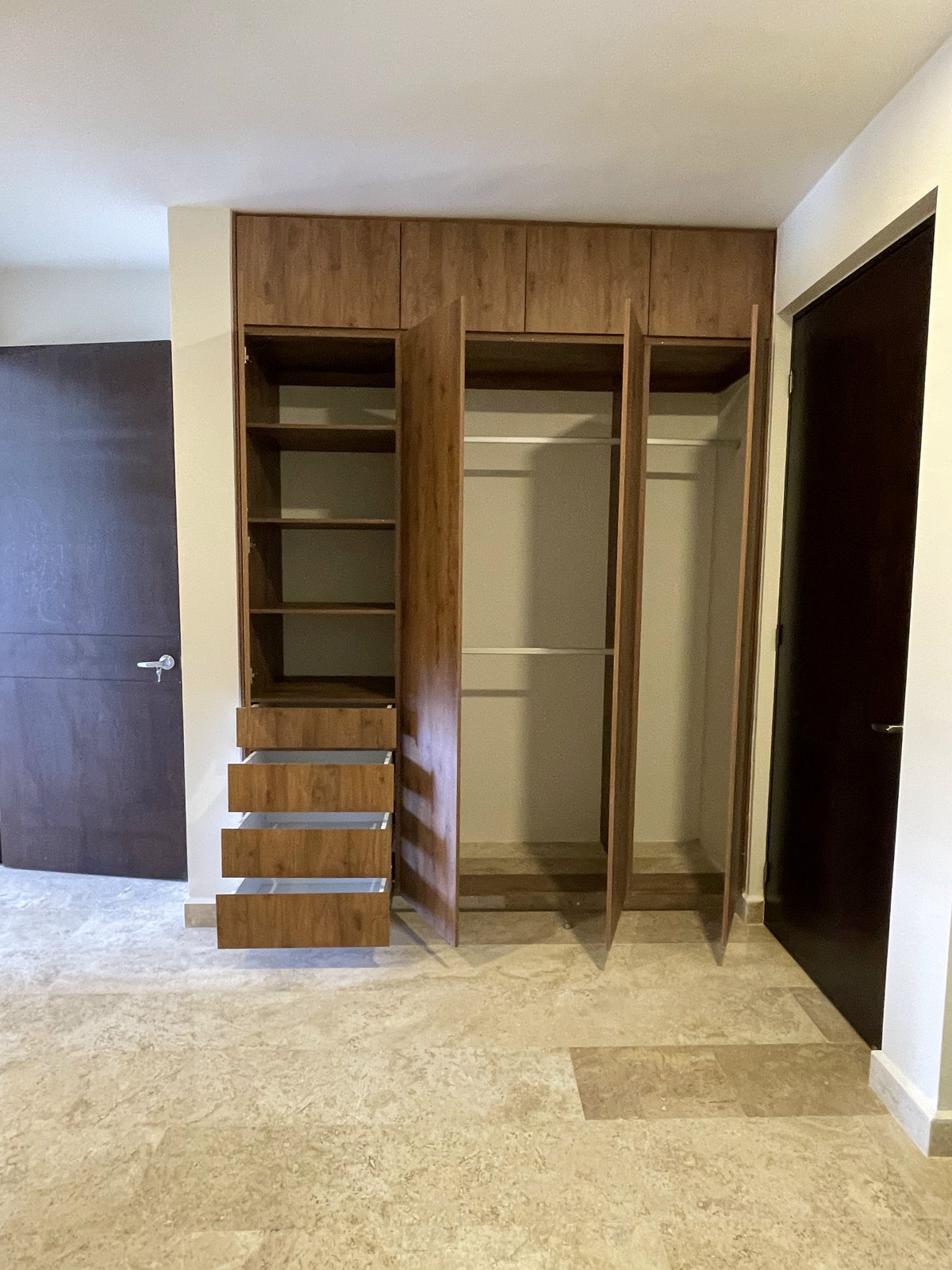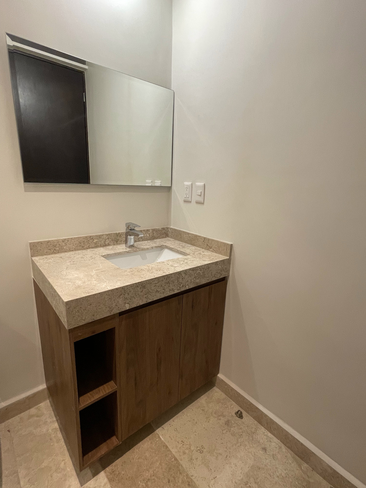 - Kitchen: concrete countertop, covered with granite; electric stove, smoke extractor, and drawers.