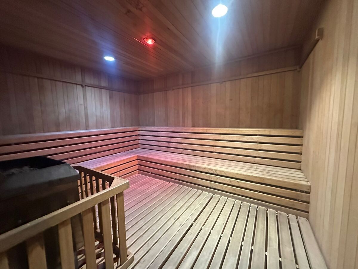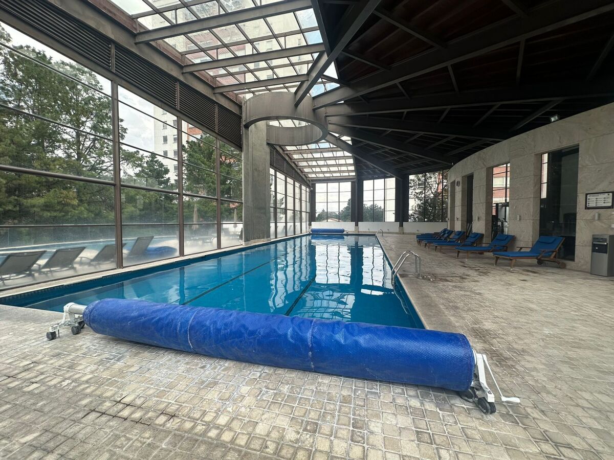 Alberca Semi olímpica techada y alberca exterior con regaderas y sauna.
