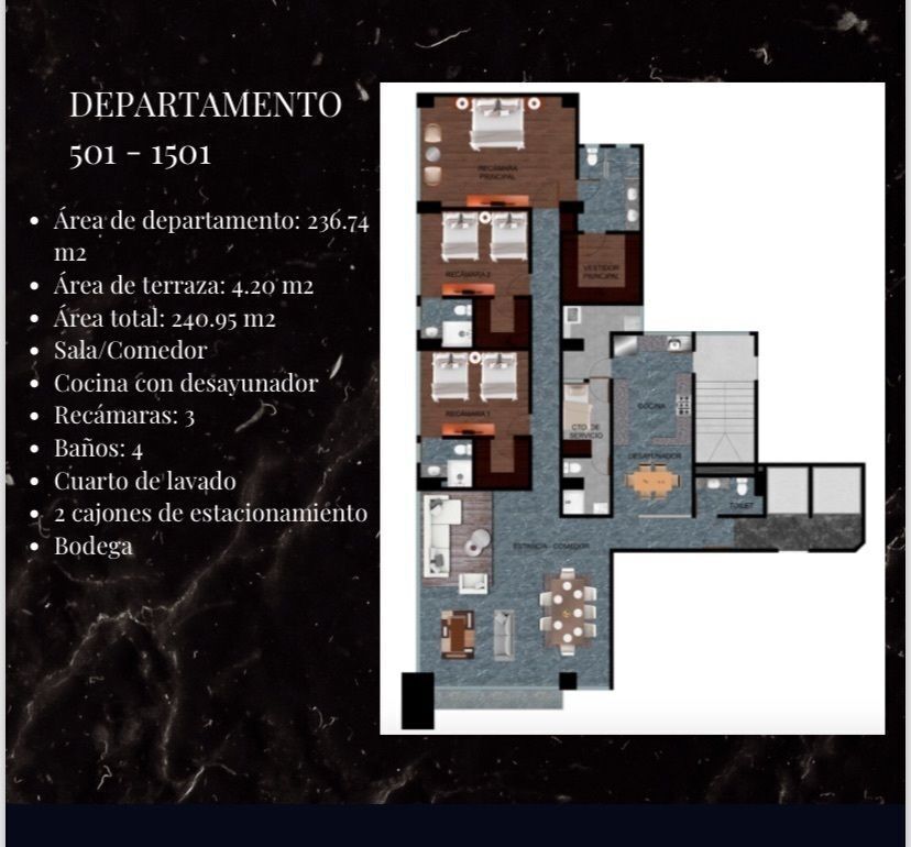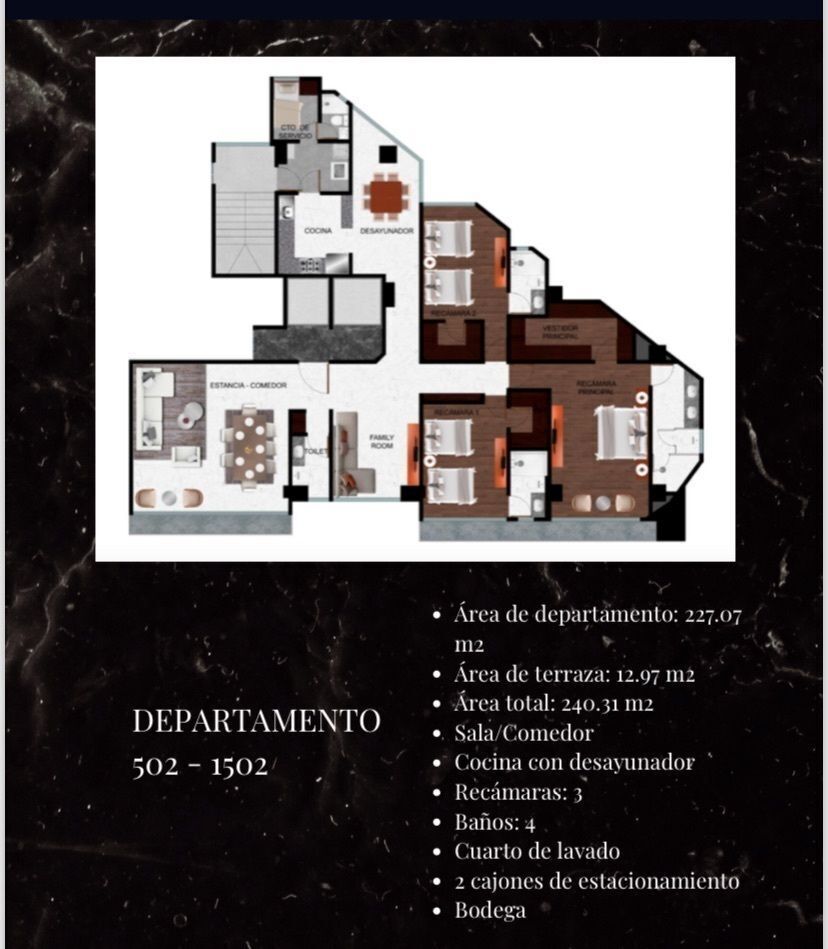 Constan de 3 recámaras con vestidor y baño, sala - comedor, antecomendor, cocina equipada, 4.5, baños, cuarto de servicio con baño y cuarto de lavado, 3 lugares de estacionamiento, bodega,