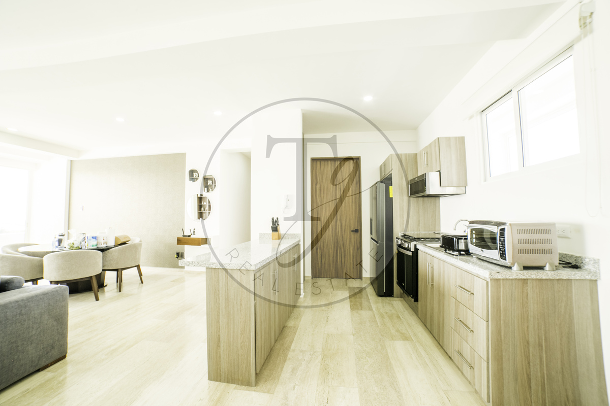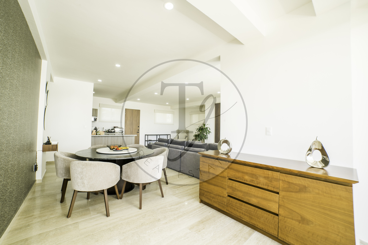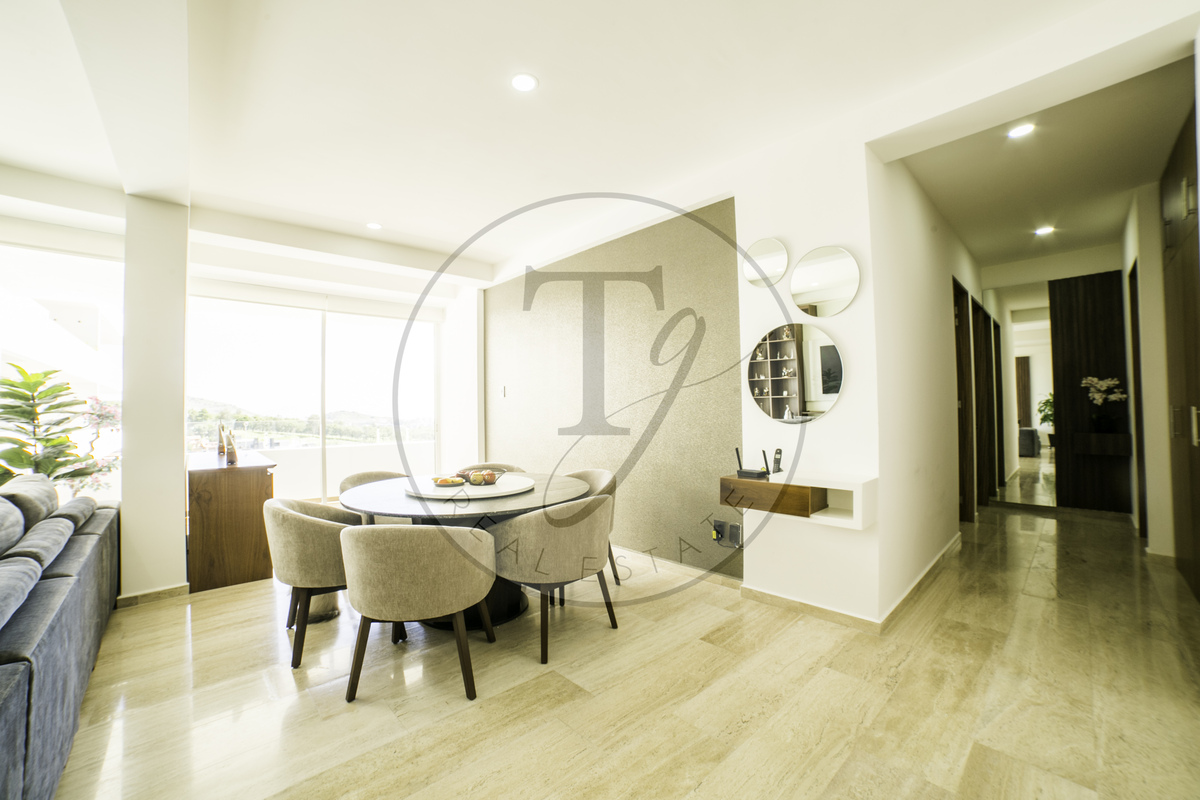 El departamento cuenta con una gran sala/comedor, dos recámaras, dos baños completos, pisos de mármol, y una amplia terraza que permite disfrutar de una vista abierta y despejada. La distribución es funcional y los espacios amplios, lo que brinda confort y calidez en cada área.
