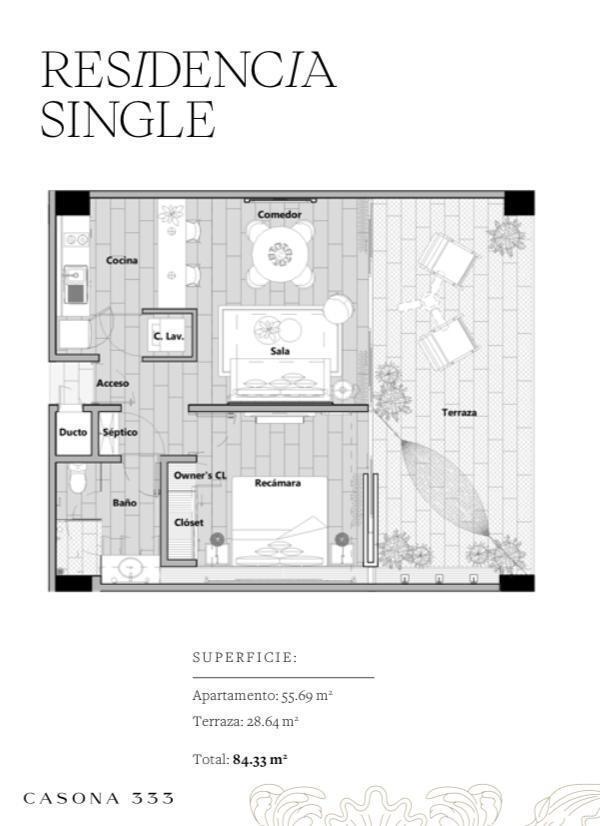 Departamento de 1 recámara de 84.33 m2 (departamento de 55.69 m+ 28.64 m de terraza)