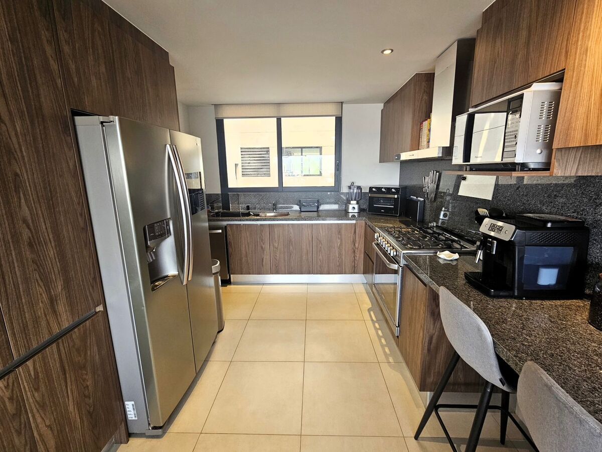 Cuenta con tres recámaras, la principal con vestidor y las secundarias con walk-in closet. Tres baños y medio, amplia sala-comedor con acceso a terraza, sala de TV, cocina equipada, cuarto de servicio, bodega y tres lugares de estacionamiento.