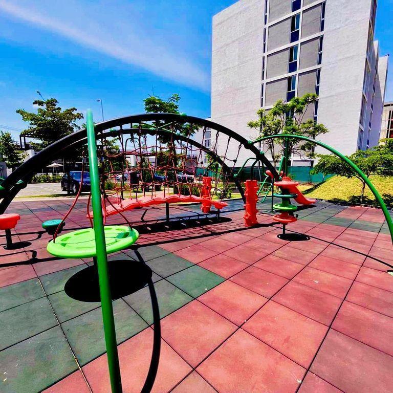 Clubhouse with pool, terraces, multipurpose court, green areas, and playgrounds for children.