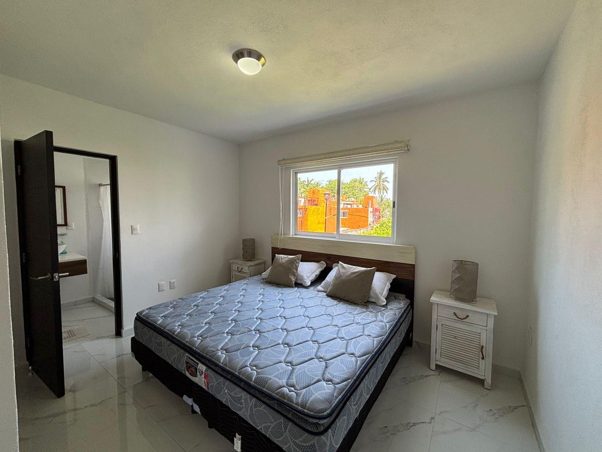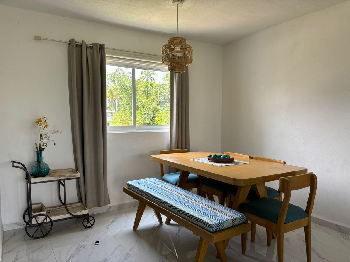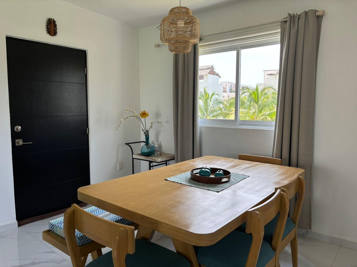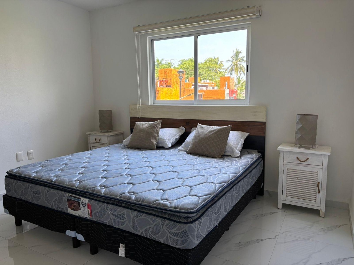 Cuenta con amplia sala, comedor para seis personas, cocina integral con refrigerador, horno microondas y eléctrico, dos recámaras, la principal con cama King Size, segunda recámara con trilitera (dos camas individuales y una matrimonial). Dos baños.