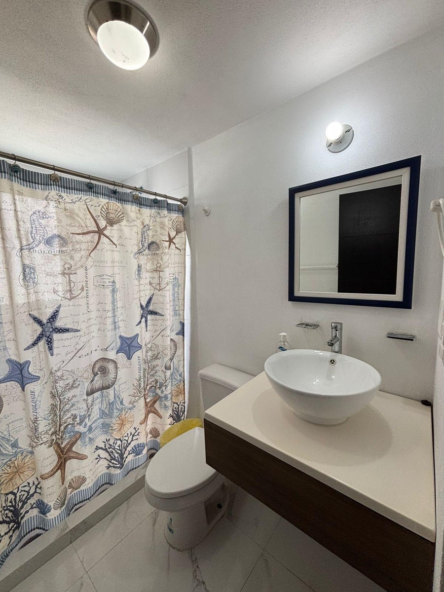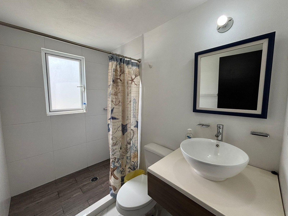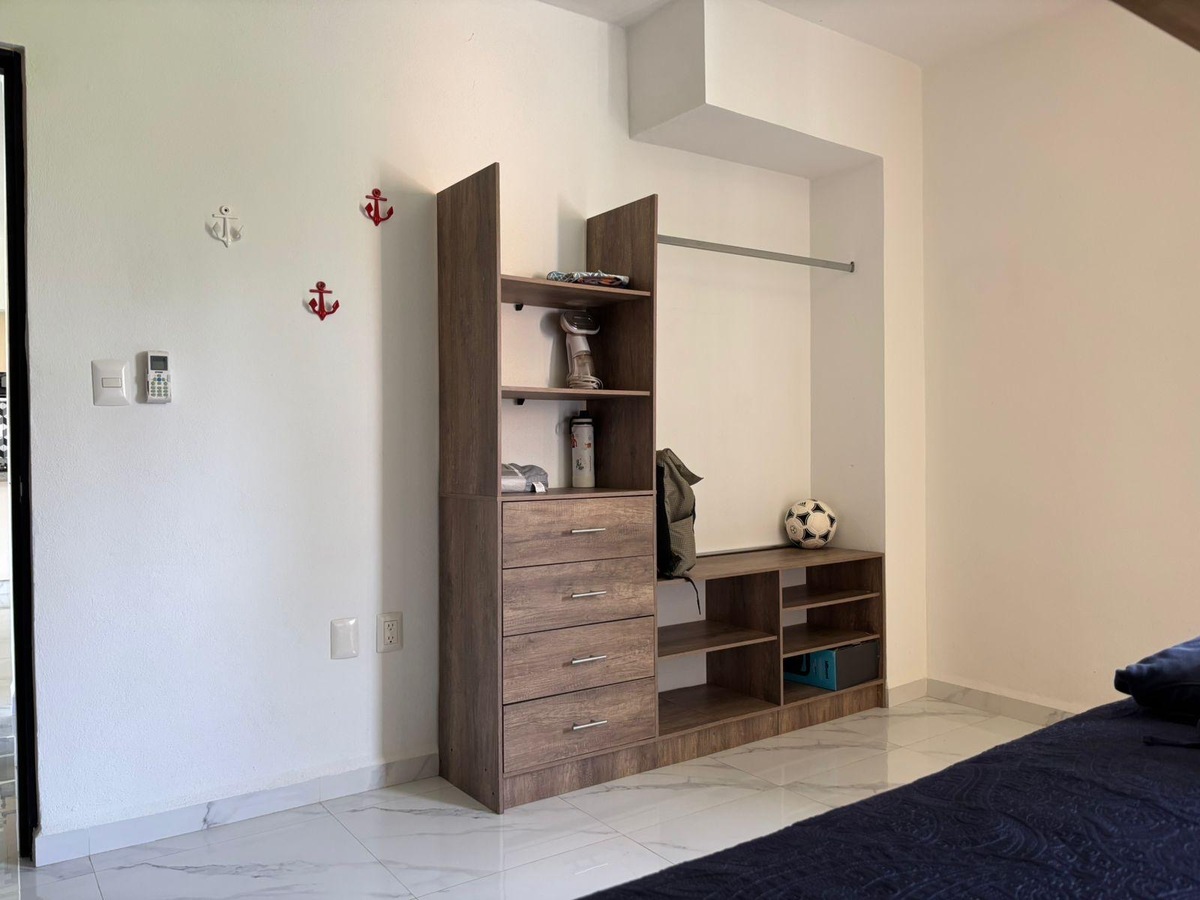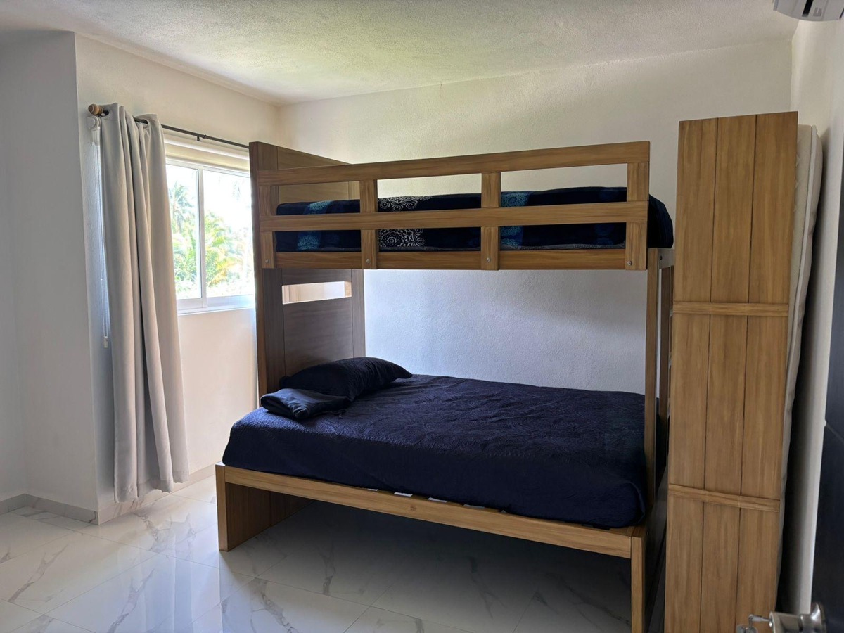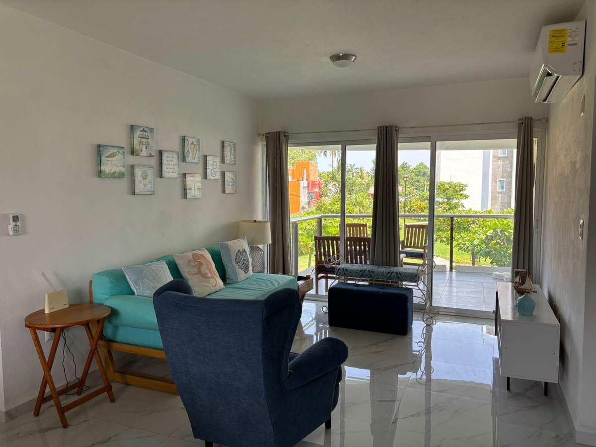 Cuenta con amplia sala, comedor para seis personas, cocina integral con refrigerador, horno microondas y eléctrico, dos recámaras, la principal con cama King Size, segunda recámara con trilitera (dos camas individuales y una matrimonial). Dos baños.