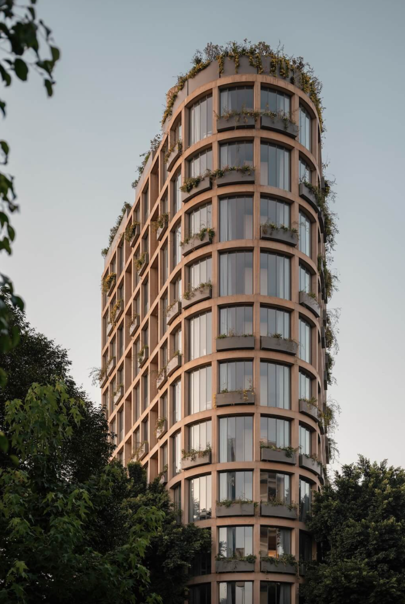 Con 44 departamentos distribuidos en 11 niveles, cada planta incorpora vegetación que enmarca los ventanales y aporta frescura visual. En la planta baja se ubican locales comerciales y una plaza pública que conecta el proyecto con su entorno urbano.