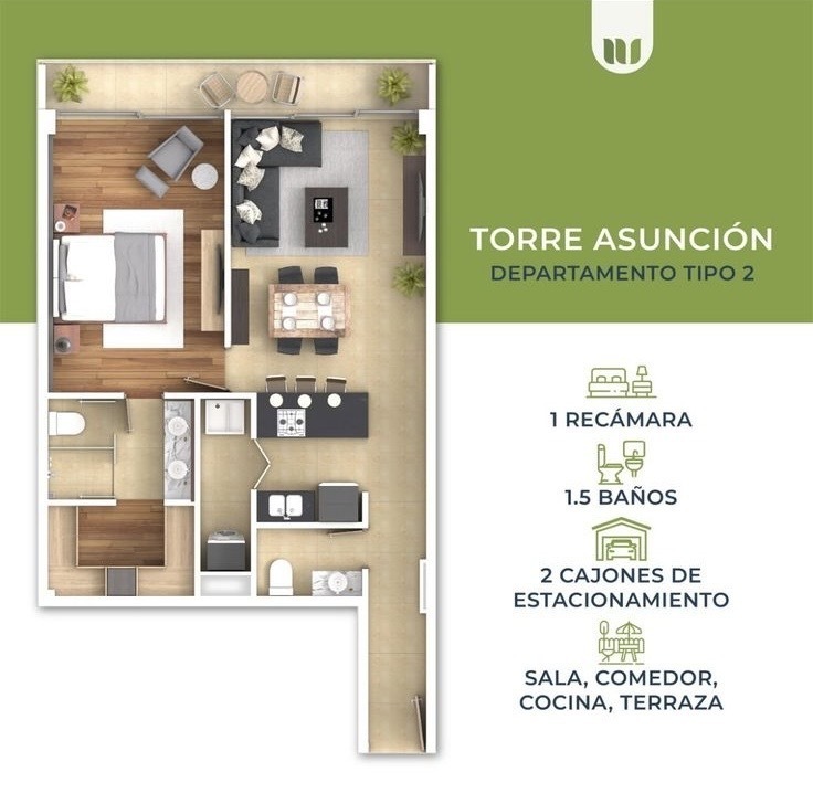 1 recámara | 1.5 baños | Estancia | Comedor | Cocina | Utility room | Terraza | 2 cajones de estacionamiento