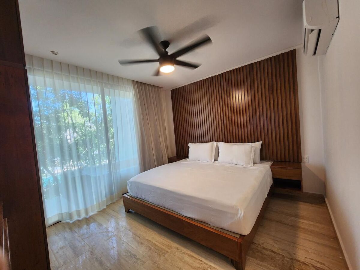 La propiedad cuenta con: 3 ventiladores, 3 aires acondicionados, cortinas, decoración, escritorios en las recamaras, closets, cristales templados, espejos, 3 TV, cama kingsize en principal con buros y detalle de lambrin en muro, 2 camas individuales en recamara con un buro, sala tipo L, mesita de centro, 6 bancos para barra, todos los accesorios de cocina.