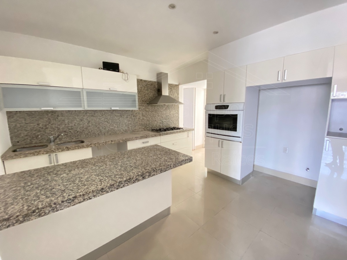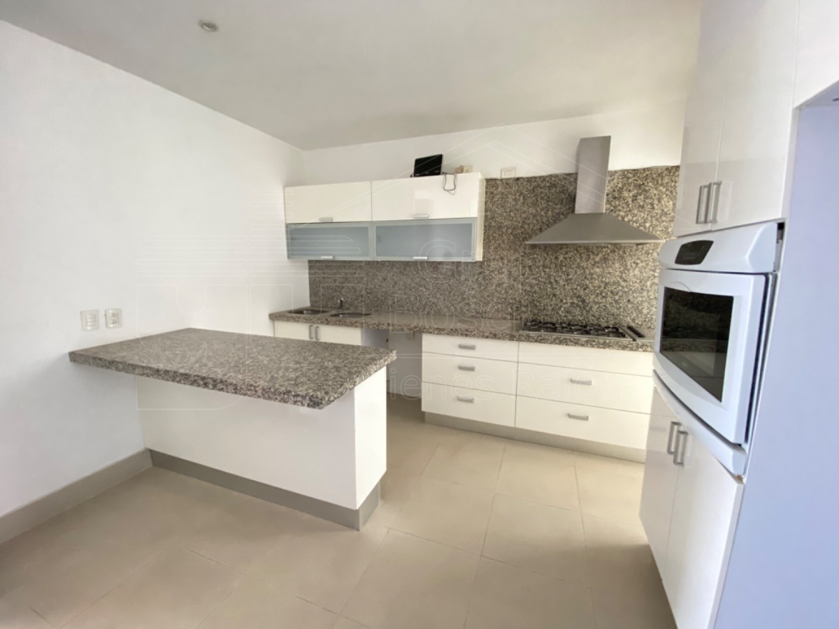 Tiene una cocina muy amplia con cubierta de granito, closet de blancos, área de lavado y cuarto de servicio.