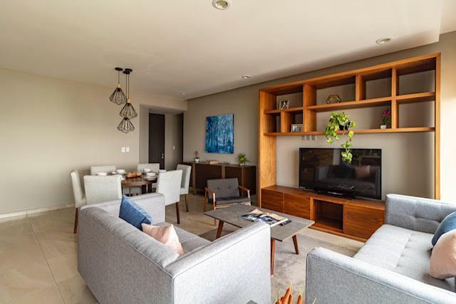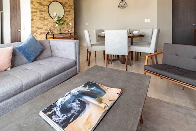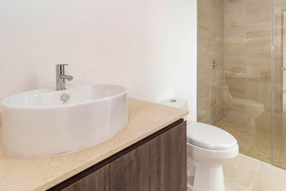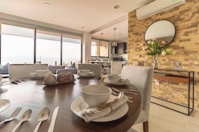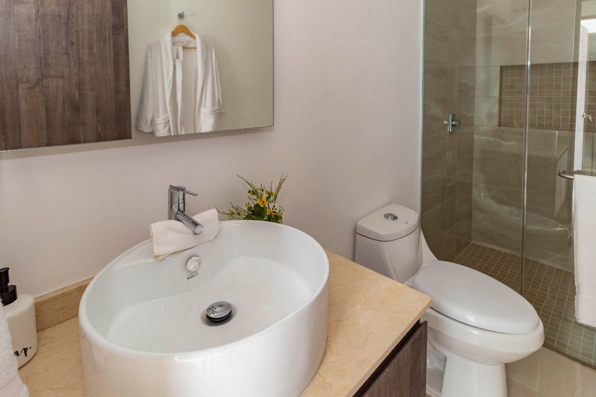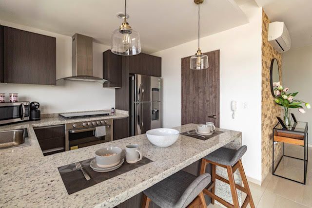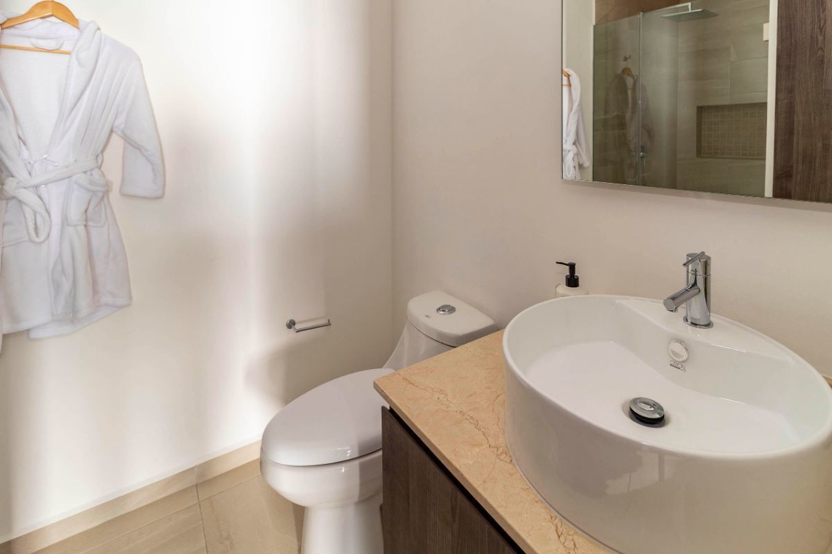 Kitchen, living room with access to terrace, dining room, laundry room, terrace, master bedroom with dressing room and full bathroom with 2 sinks leading to terrace. 1 secondary bedroom with full bathroom and closet, half bathroom for guests.