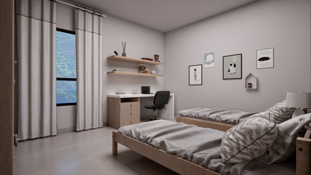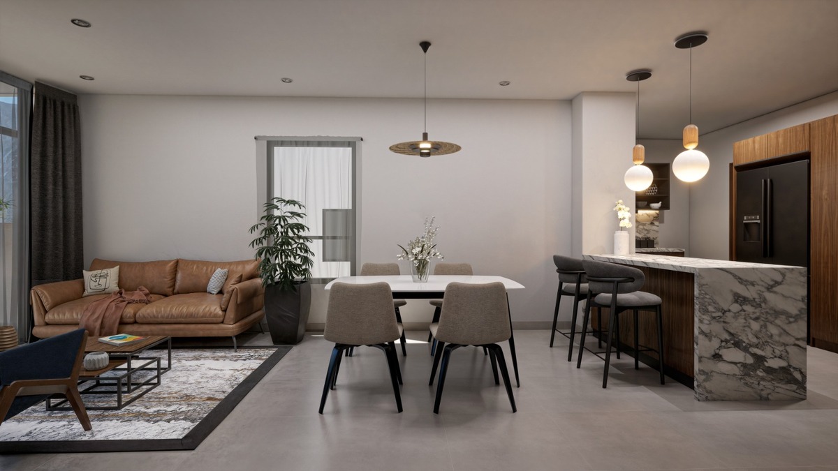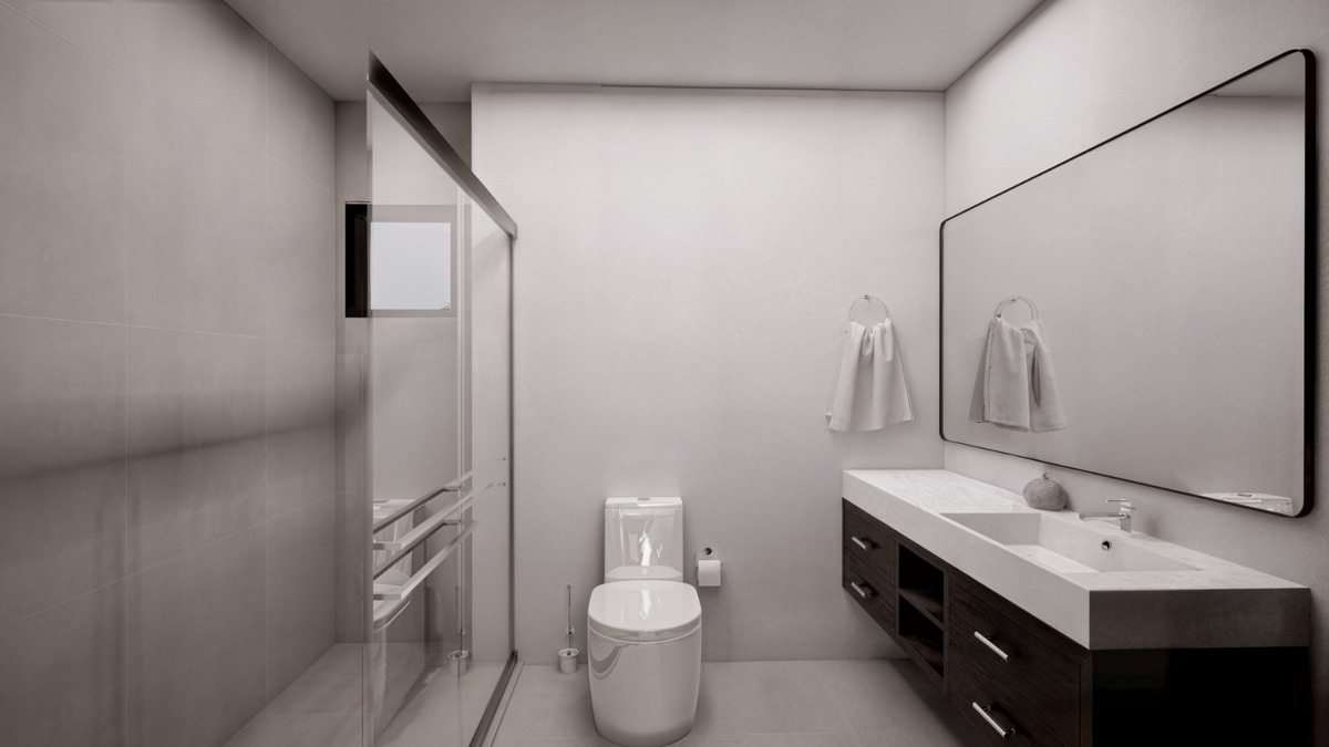 2 recámaras, área flex, 2 baños, baño de visitas, lavandería, balcón, bodega, 2 cajones de estacionamiento.