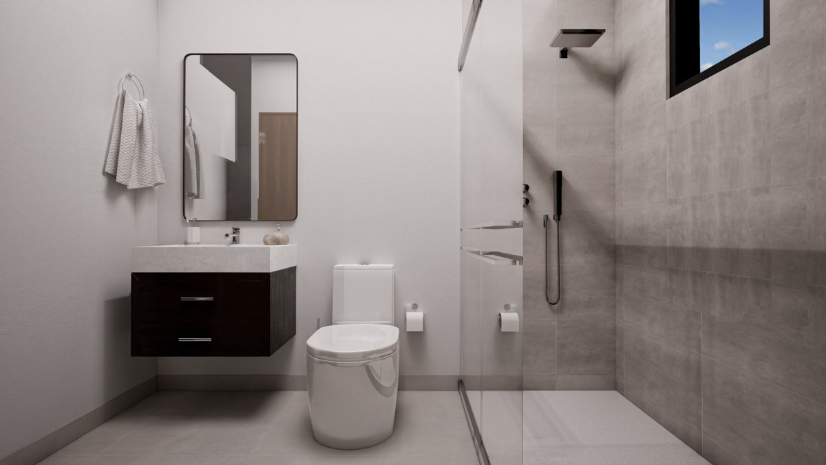 2 bedrooms, flex area, 2 bathrooms, guest bathroom, laundry, balcony, storage, 2 parking spaces.