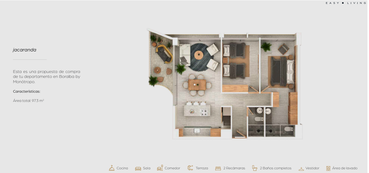 El departamento Jacaranda ofrece 95 y 97.3 m², con una distribución moderna y funcional: 2 recámaras, 2 baños completos y 2 cajones de estacionamiento. Sus acabados premium, amplios ventanales y detalles arquitectónicos crean un ambiente elegante, luminoso y acogedor.