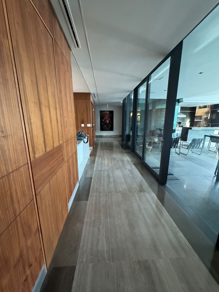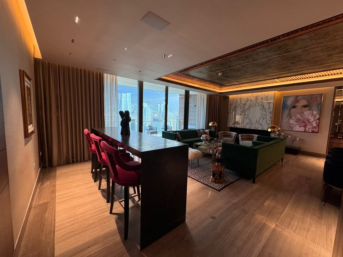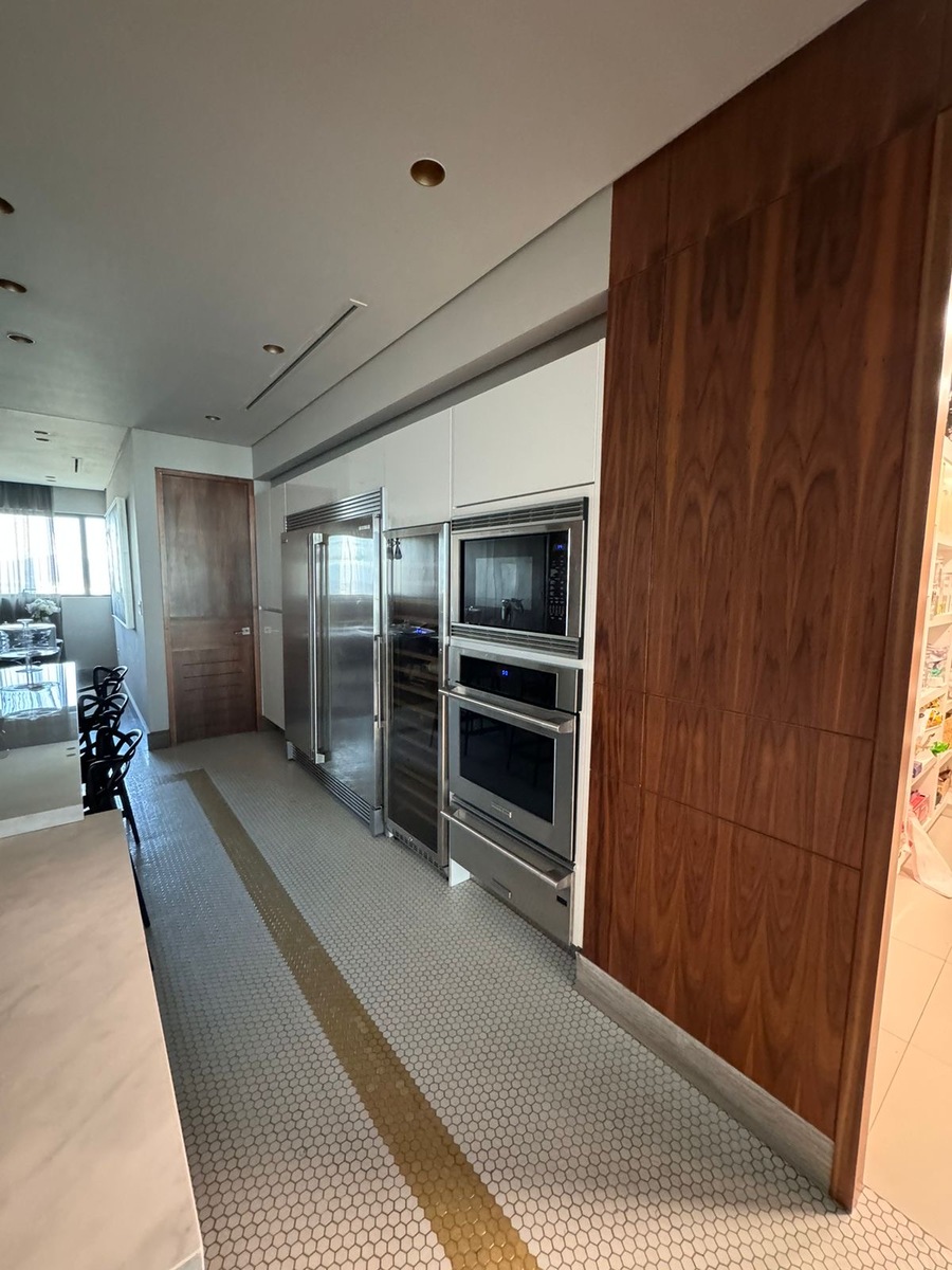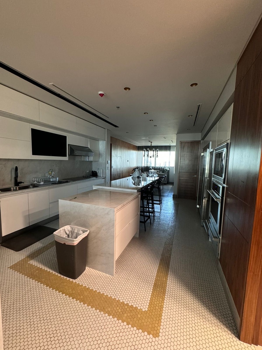 Cocina equipada, sala, comedor, bar, oficina, lavanderia y cuarto de servicio.