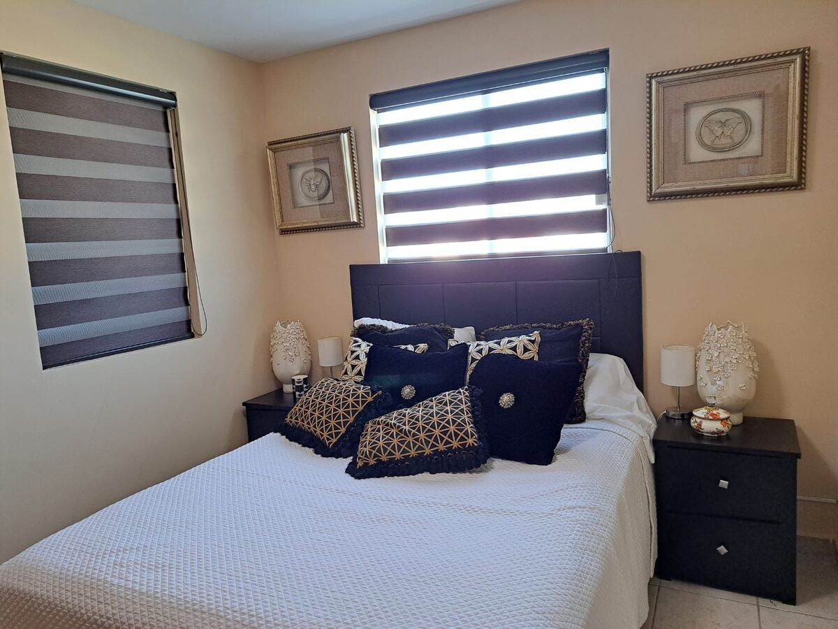 Recámara principal con TV clima 1 1/2 ton inverter calor y frío, cama queen , persianas baño completo clóset 2 burós abanico de techo.