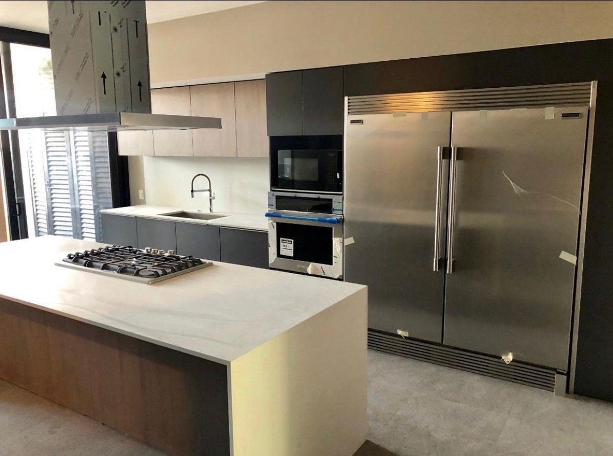 Large kitchen with quartz countertop, DADA kitchen. Premium range appliances.