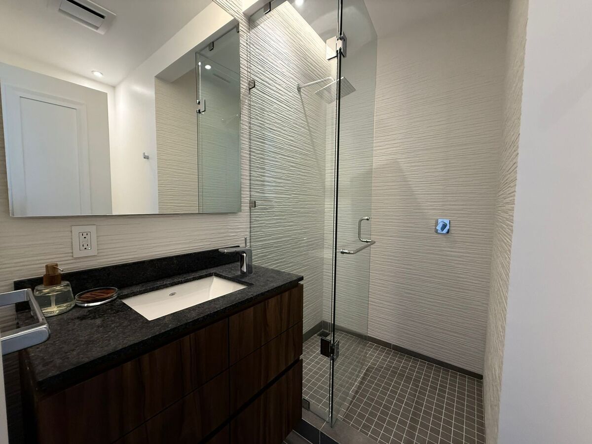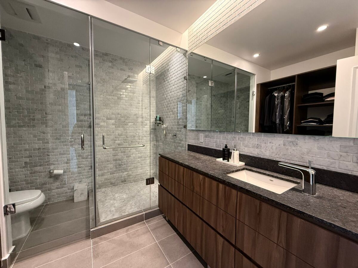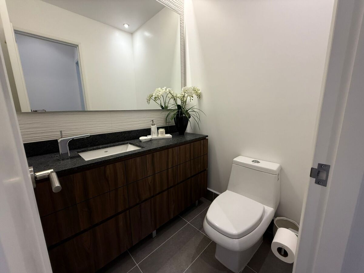 It has THREE BEDROOMS, the main one with a full bathroom and a walking closet. Second bedroom with a full bathroom and closet, third bedroom with closet and full bathroom, all with wooden floors and bathrooms with porcelain tile floors and tempered glass partitions.