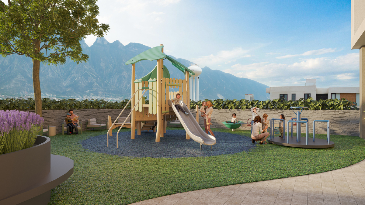Cuenta con terrazas verdes, senderos, jardines con riego por aspersión, zonas lounge al aire libre, espacios fitness, banquetas amplias, cruces peatonales seguros e iluminación subterránea estratégica.
