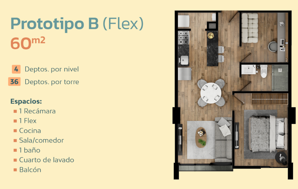 117 condominios con tipologías de 1 recámara, 1 recámara + flex y 2 recámaras