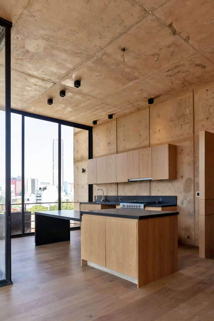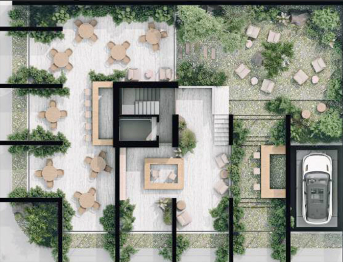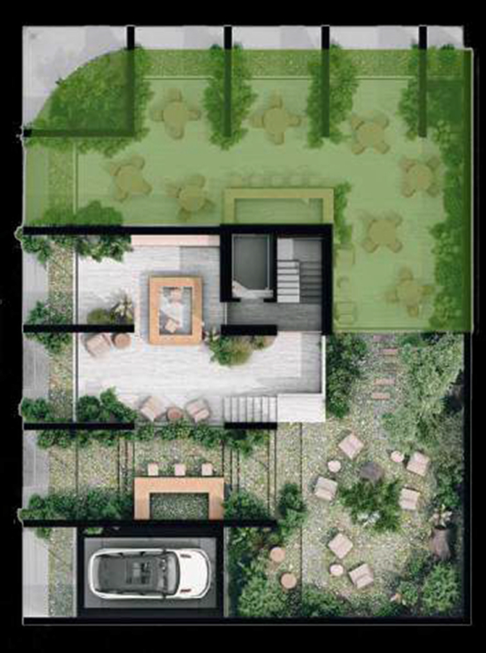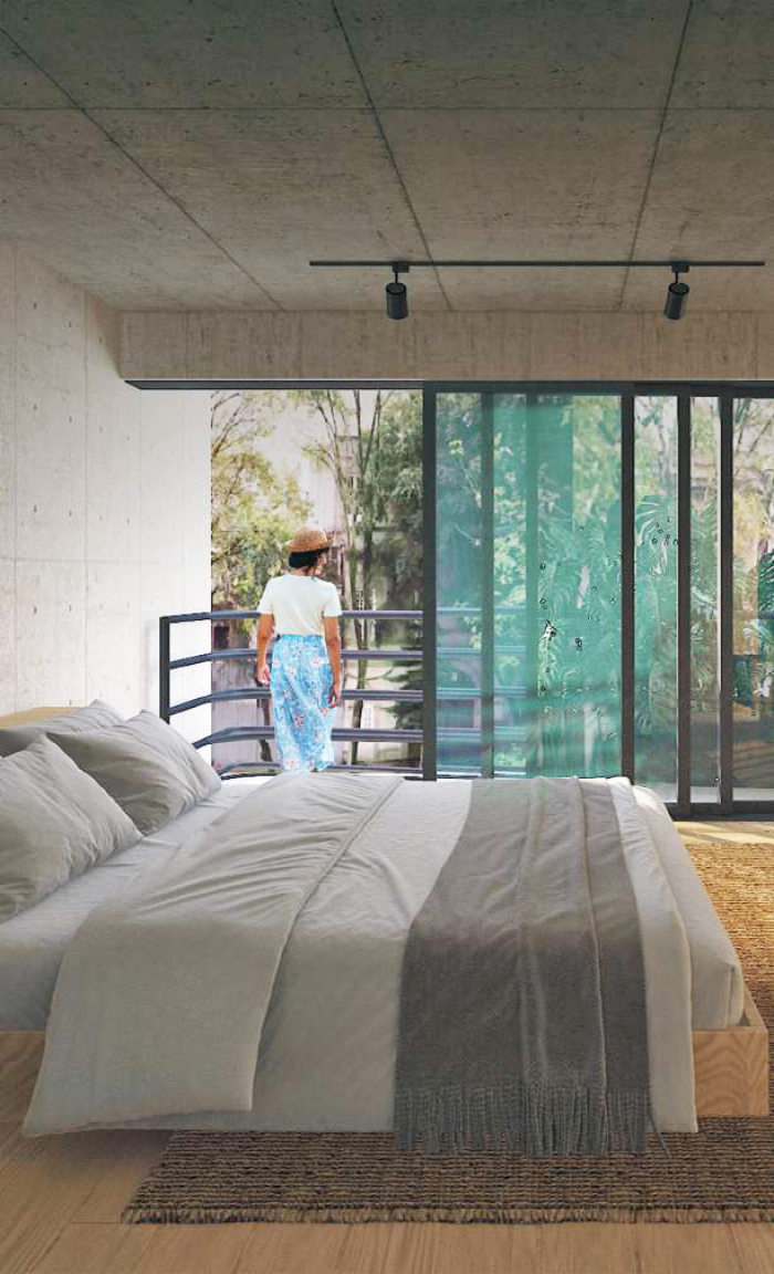 Donde la planta baja es un espacio comercial y público que se convierte en jardín y permite un flujo absoluto entre ambas calles creando así un pequeño corredor urbano. Los siguientes niveles son vivienda compacta pero siempre en contacto con espacios ventilados, generosos y con espacios de vegetación.