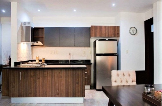 Cocina Integral con barra de granito, campana en cristal, estufa mabe y tarja de acero inoxidable