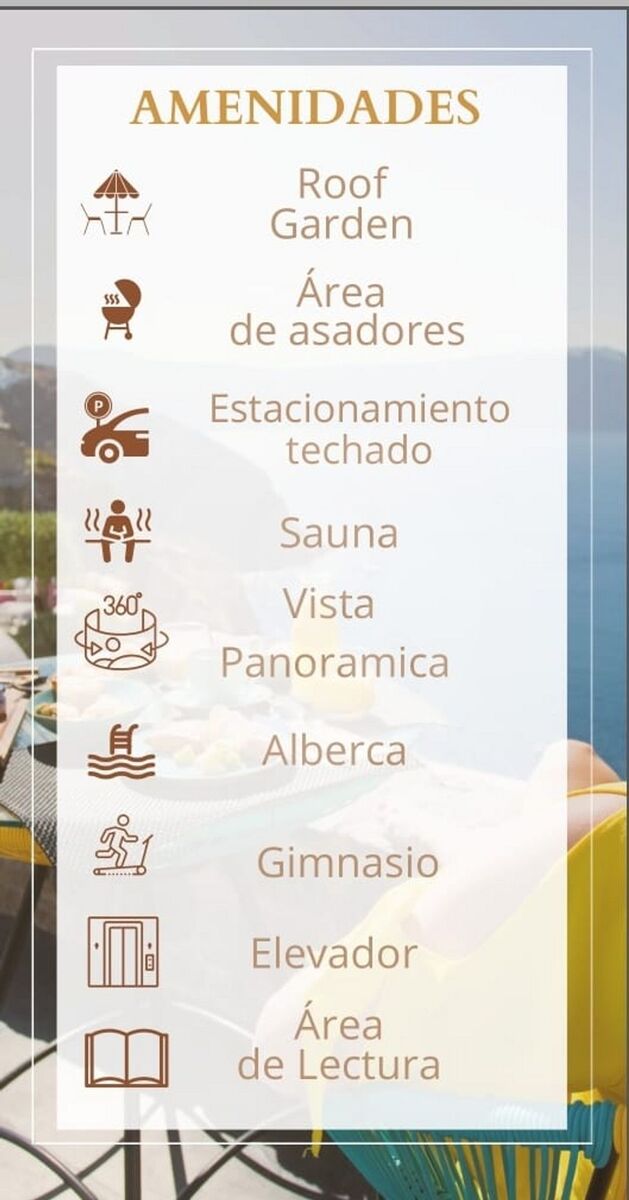 También ofrece a sus residentes amenidades como roof garden con alberca y asadores, gimnasio, sauna, área de lectura, acceso controlado, estacionamiento techado y elevador.
