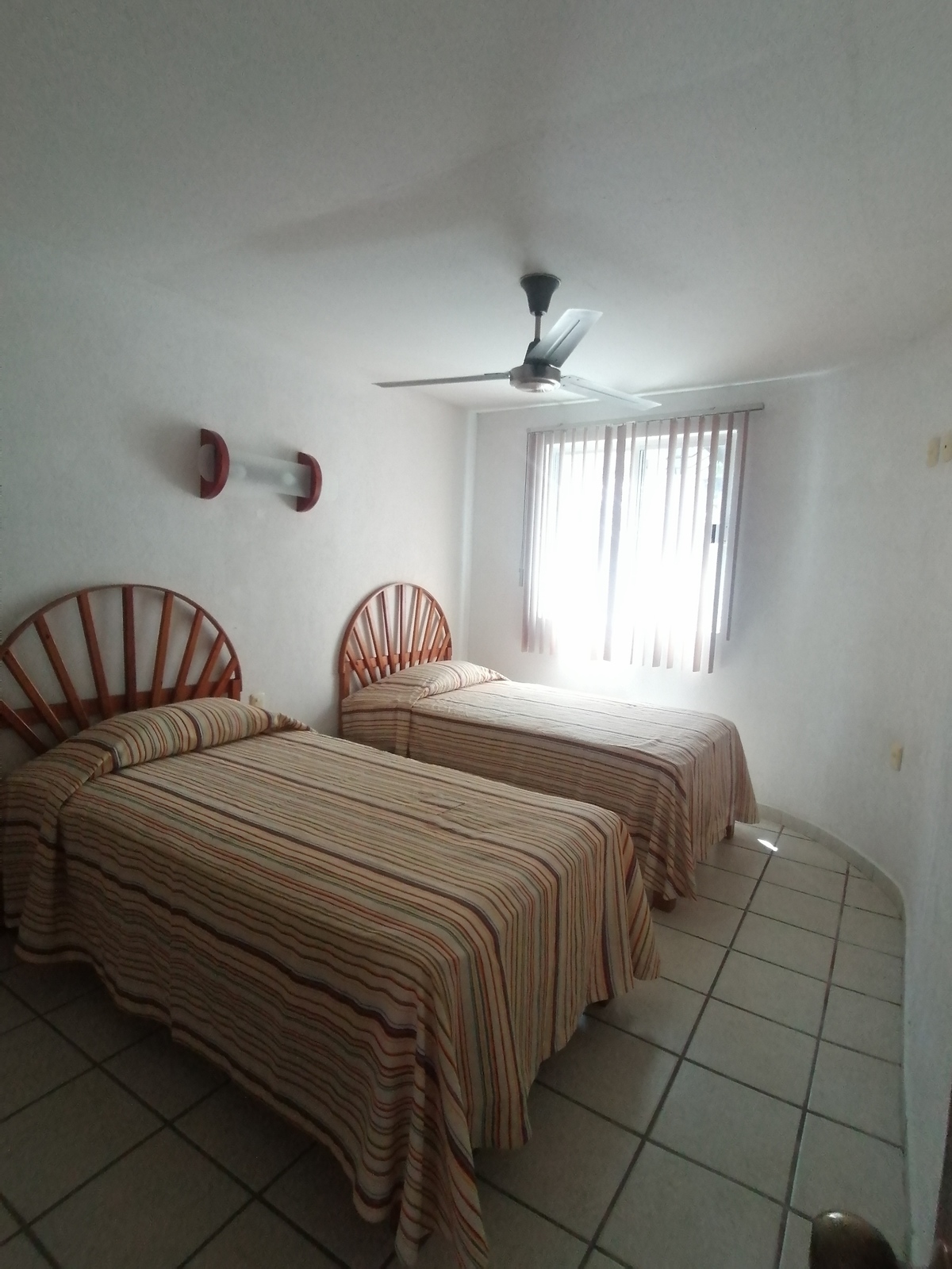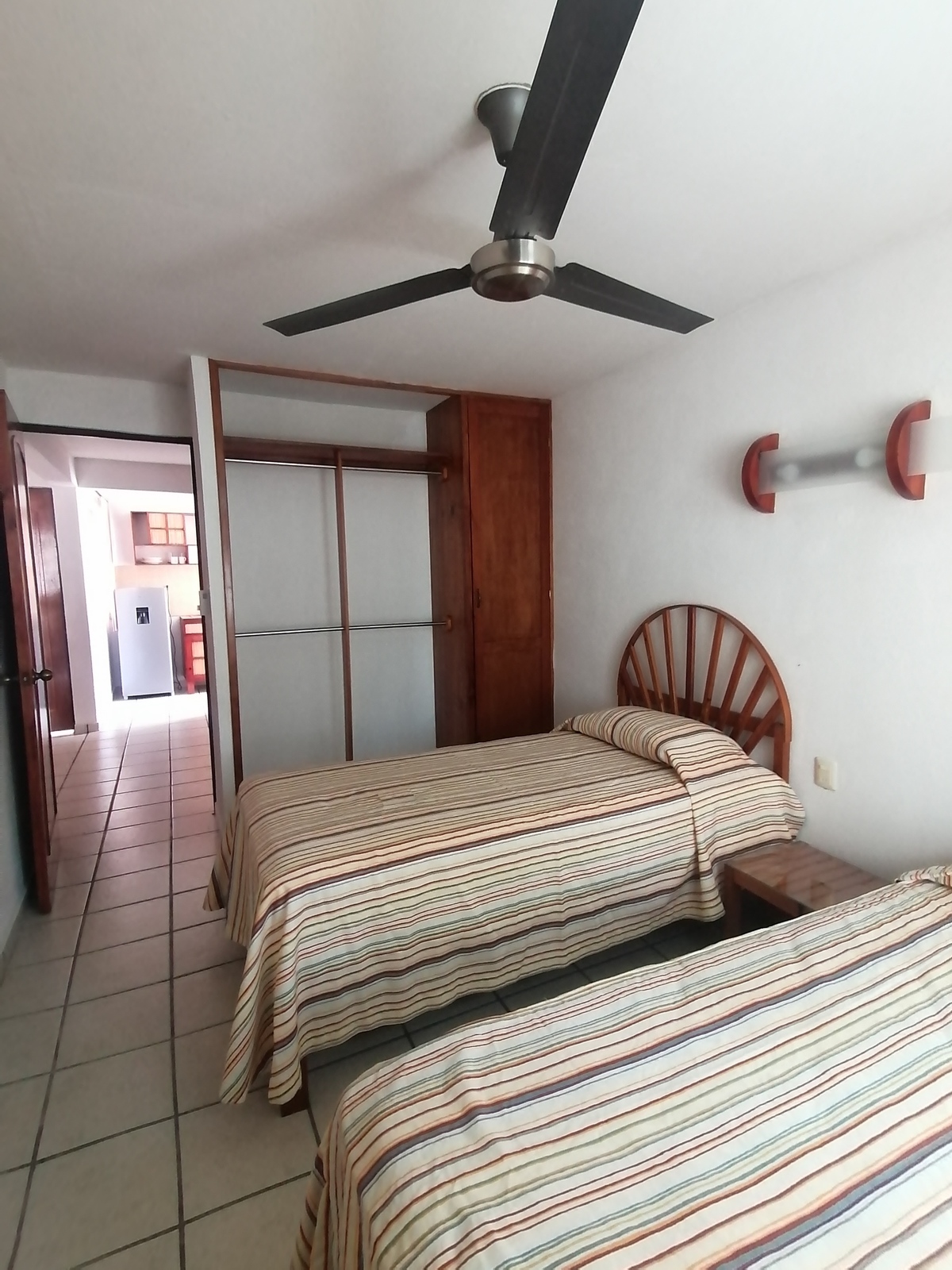 Una recámara cuenta con camas individuales, ventilador, closet, tv.