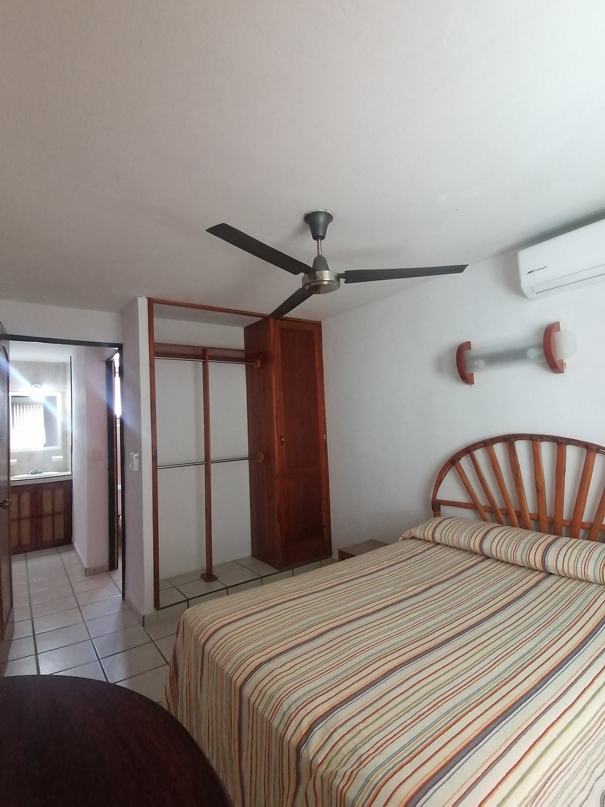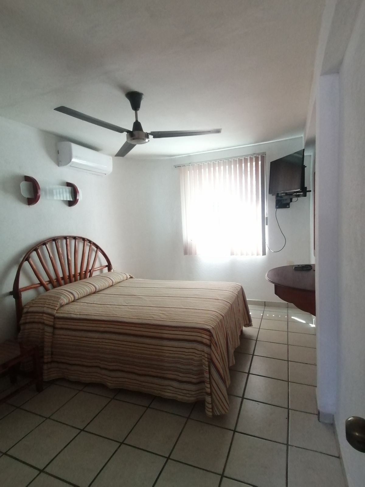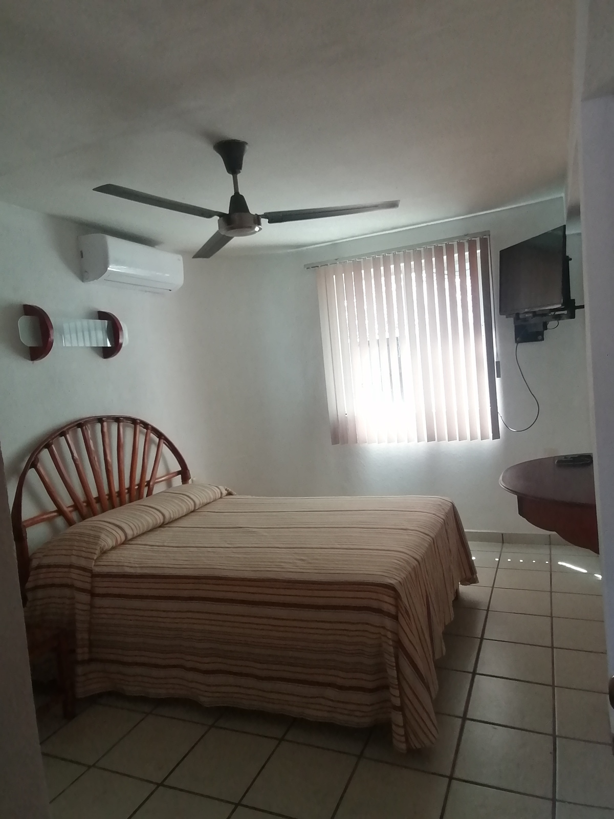 Recámara principal con cama matrimonial, ventilador, aire acondicionado, tv.