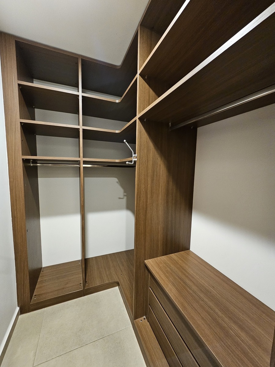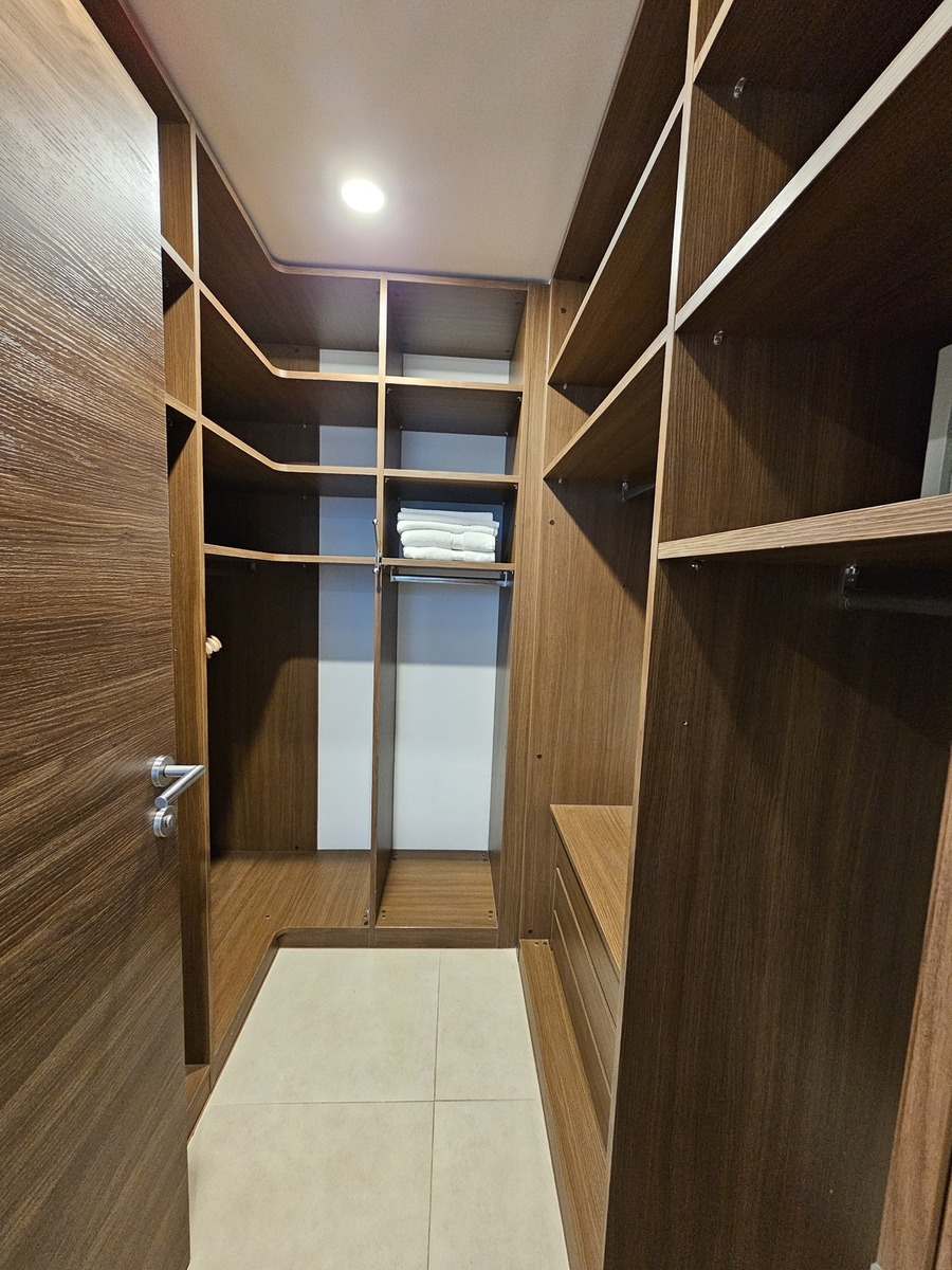 This minimalist-style apartment is fully furnished and equipped, ready to move in. The master bedroom is spacious and features a king-size bed, a full bathroom, and a walk-in closet. The secondary bedroom has two single beds, a walk-in closet, and a private bathroom.