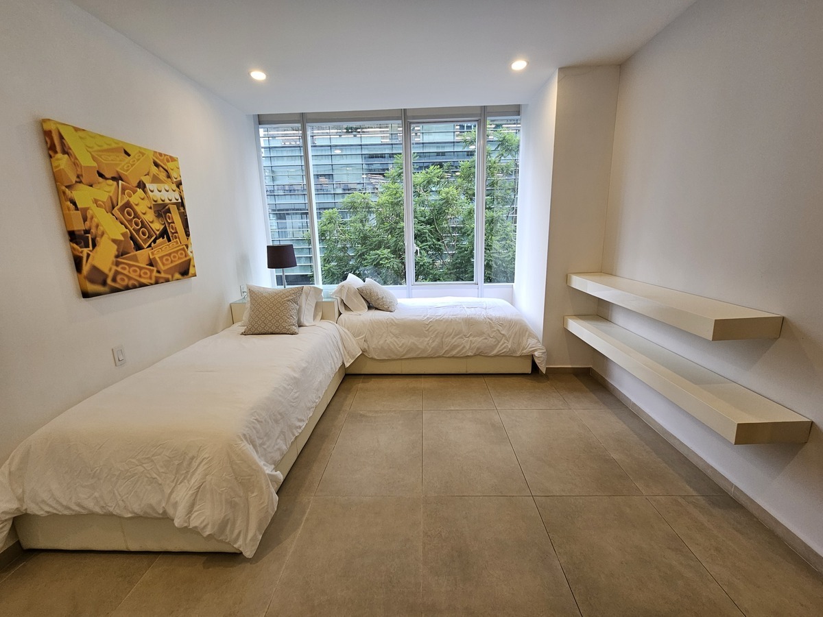Este departamento de estilo minimalista está completamente amueblado y equipado, listo para mudarse. La recámara principal es amplia y cuenta con cama king size, baño completo y vestidor. La recámara secundaria tiene dos camas individuales, vestidor y baño privado.