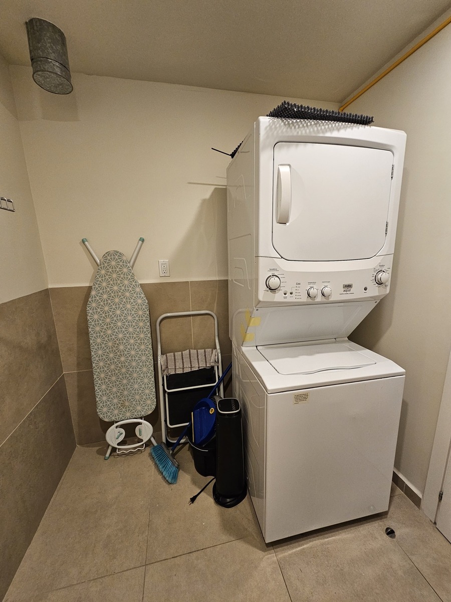 The apartment also includes a large open kitchen, a half bathroom for guests, a dining room, a living room with a screen and a sofa bed, and a fully equipped laundry room.