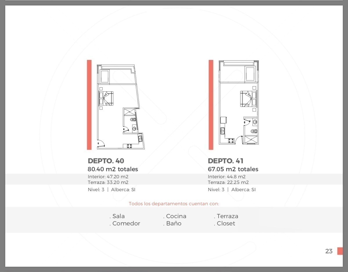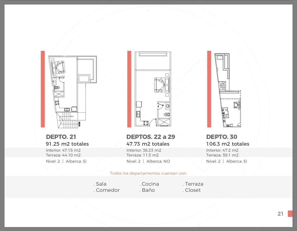 Cuenta con 41 unidades de una habitacion distribuidos entre PB y tres niveles, los cuales van desde los 47m2 / 506sq ft hasta los 106m2 / 1,141sq ft, con espacios muy amplios para departamentos boutique, entregando amueblado y equipado, llave en mano, hasta el papel higiénico.