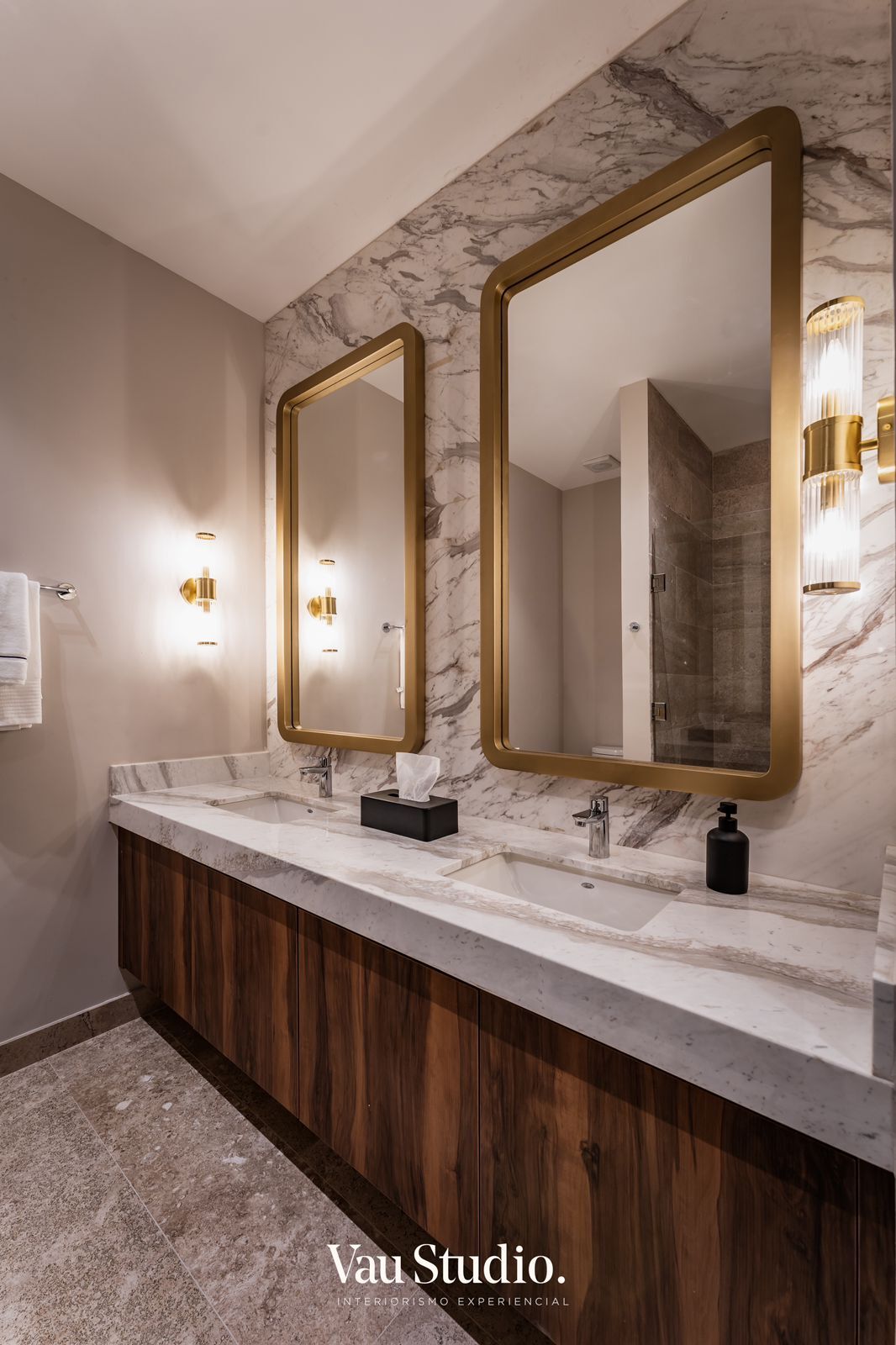 -Mueble de baño con gabinetes de acabado tipo nogal