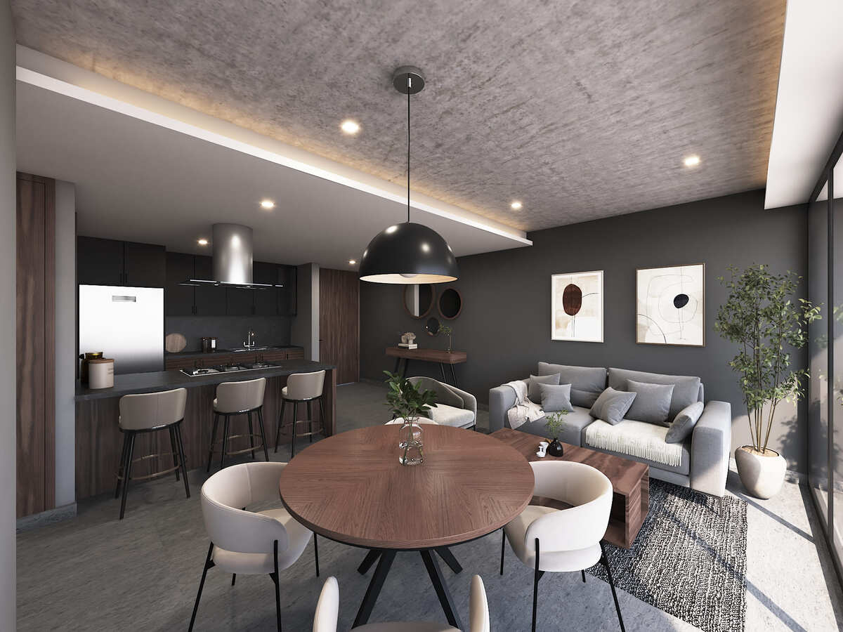 • Distribuciones inteligentes con sala-comedor, cocina integral y área de lavado