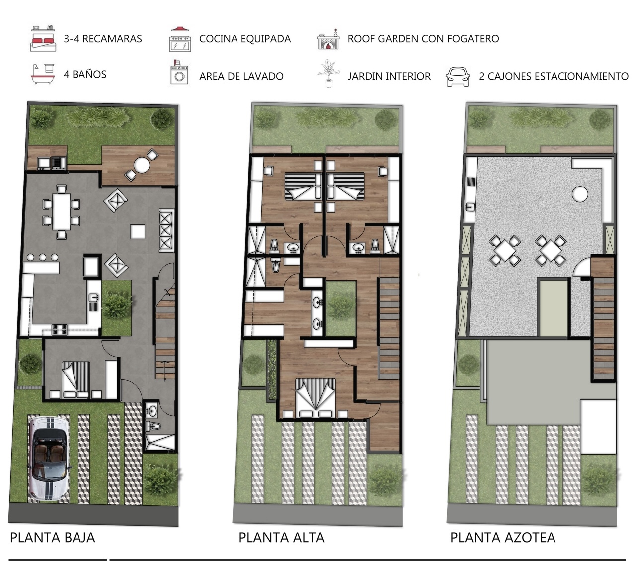 Planta baja: Baño completo, estudio o 4ta habitación, sala, comedor, cocina equipada, terraza, jardín interior y exterior, cisterna