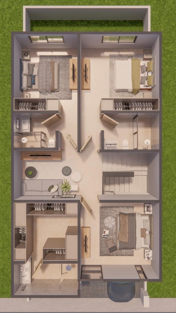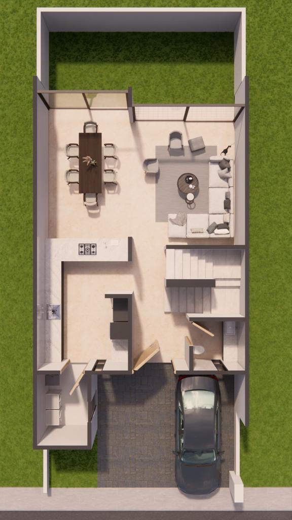 Planta baja: 1/2 baño, sala, comedor, cocina con cubierta de cuarzo y alacena, jardín, cuarto de lavado, cisterna de 5,000 lts.