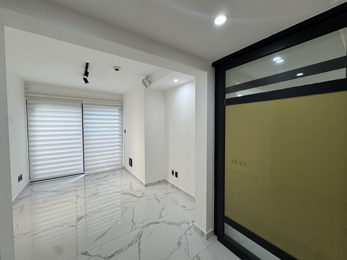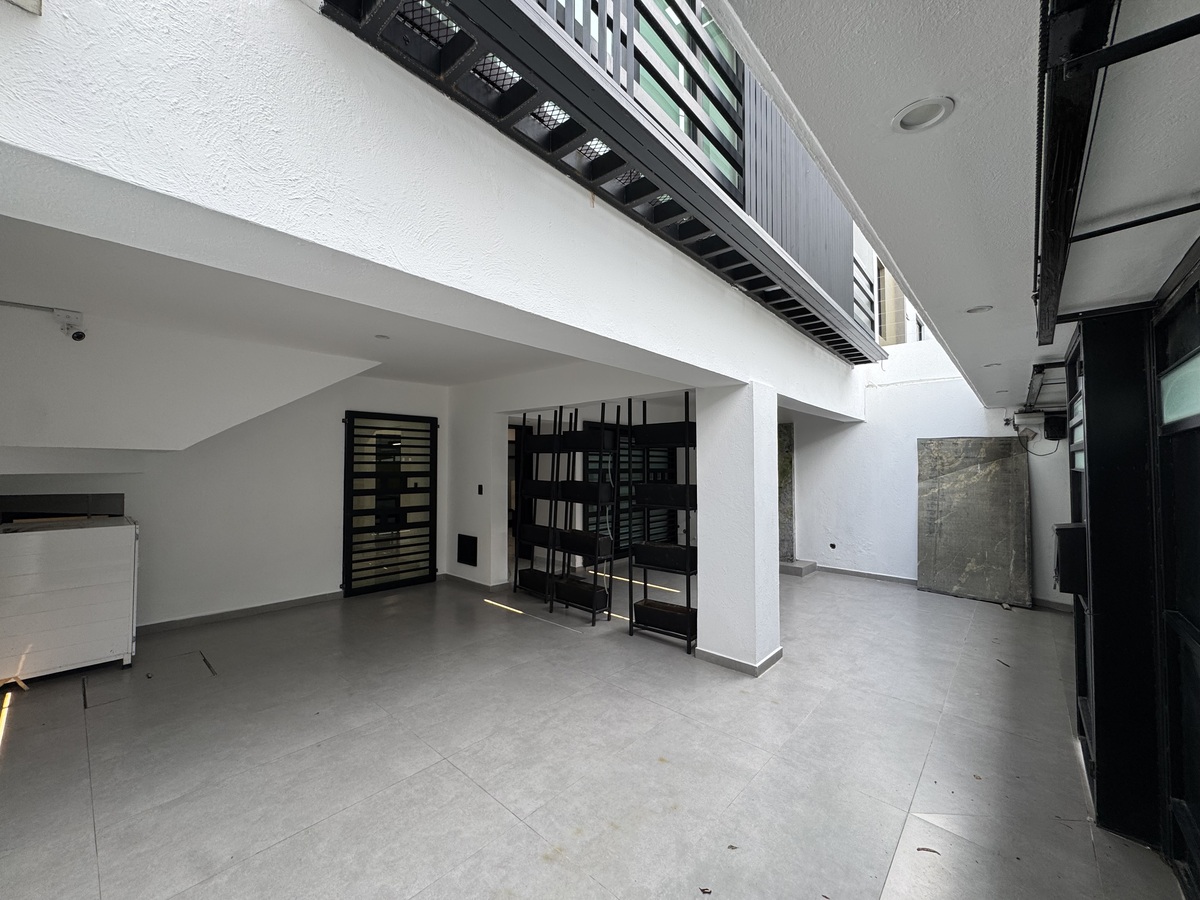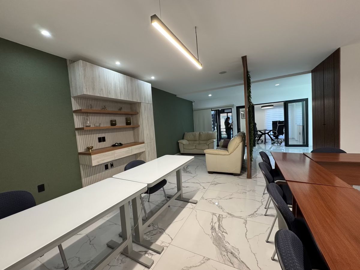 PB – Estacionamiento 2 autos, Recepción, ½ baño, Sala de Juntas grande, Espacio de trabajo para 6-7 personas y Oficina principal con baño propio y terraza con fuente.