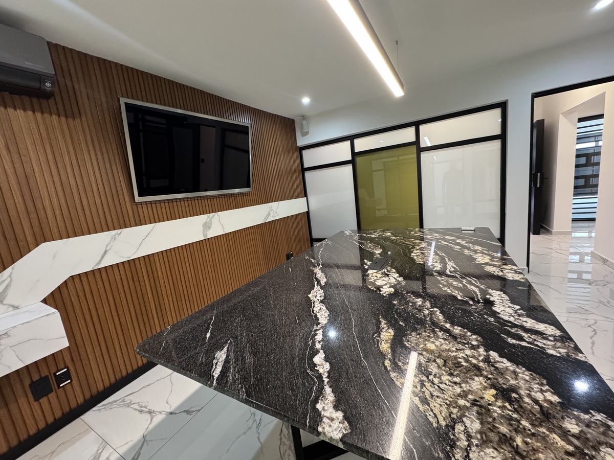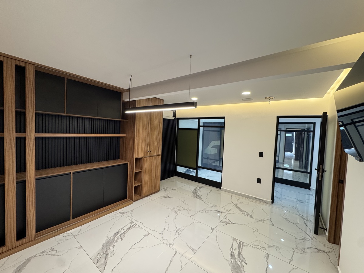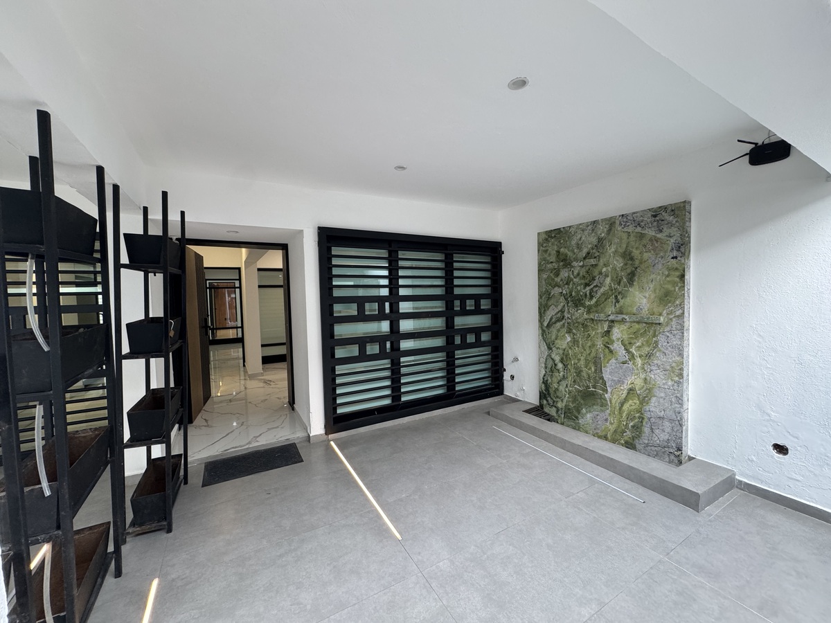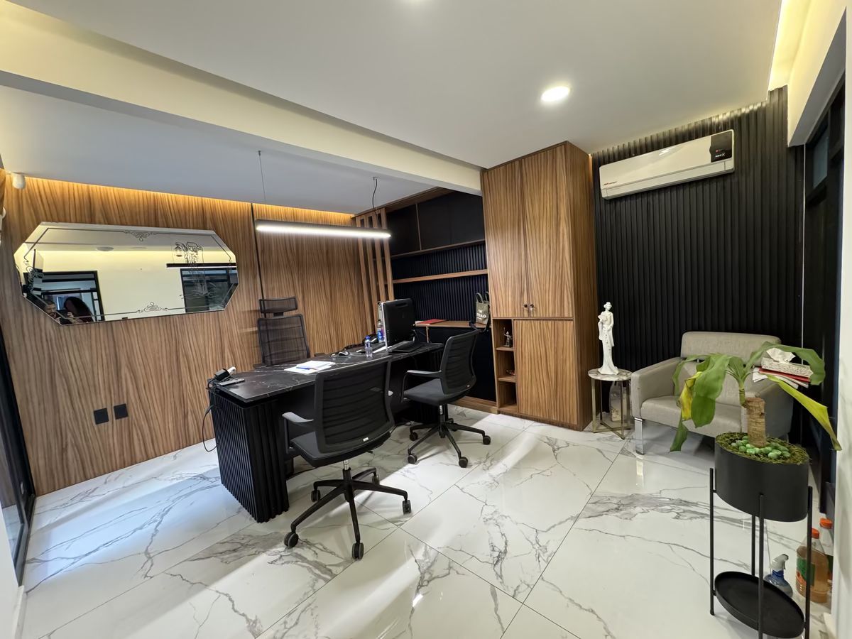PB – Estacionamiento 2 autos, Recepción, ½ baño, Sala de Juntas grande, Espacio de trabajo para 6-7 personas y Oficina principal con baño propio y terraza con fuente.