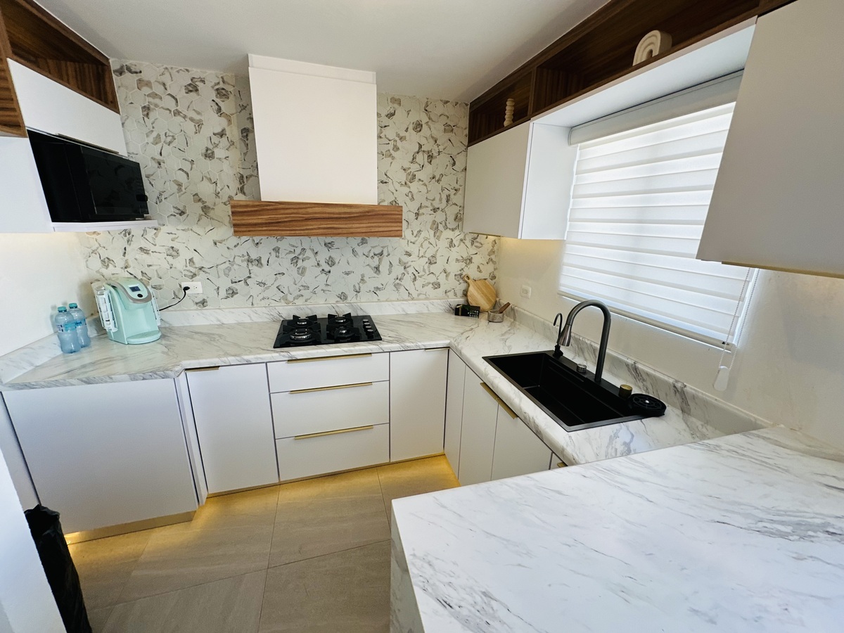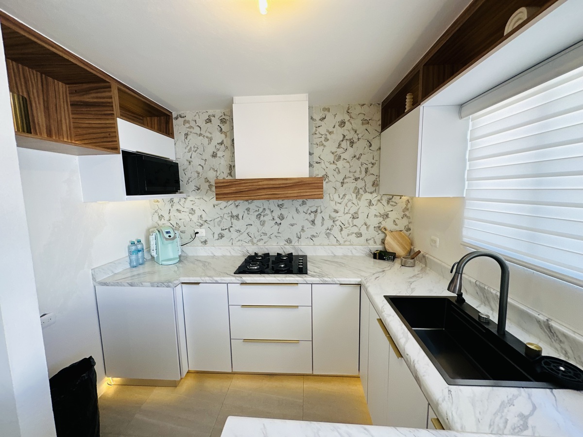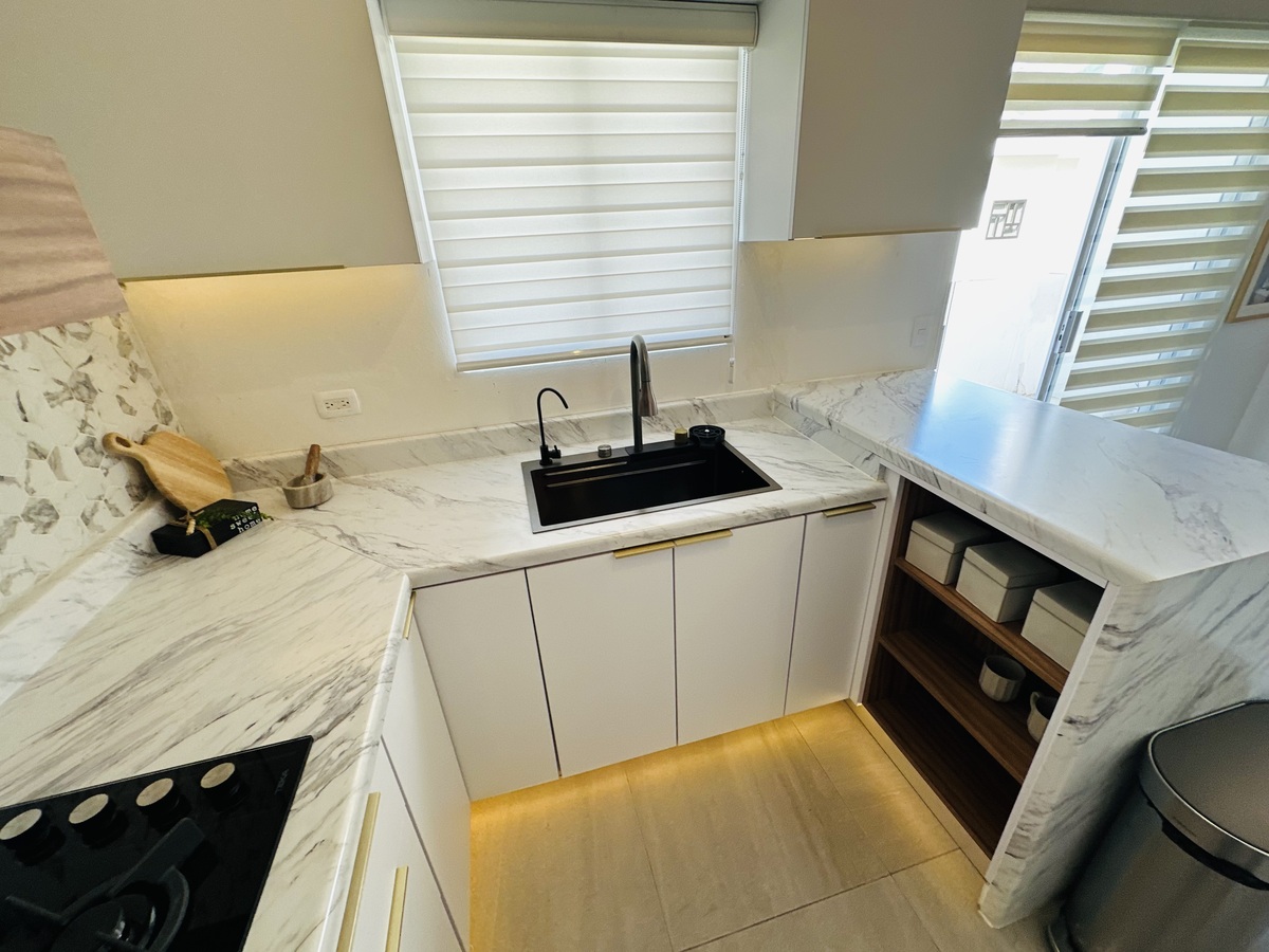 • Cocina integral equipada con estufa, campana, microondas, tarja con set completo y luces LED; posibilidad de agregar refrigerador si se requiere.