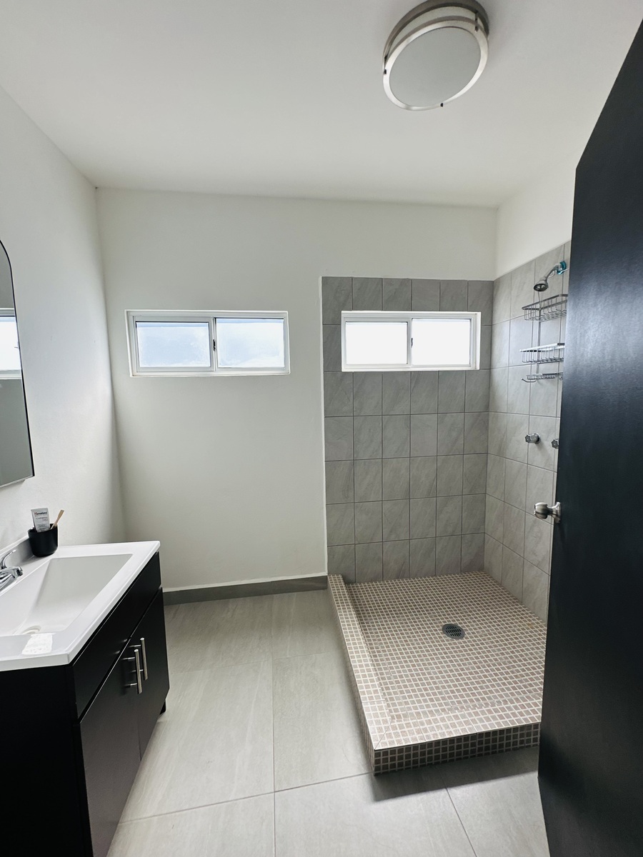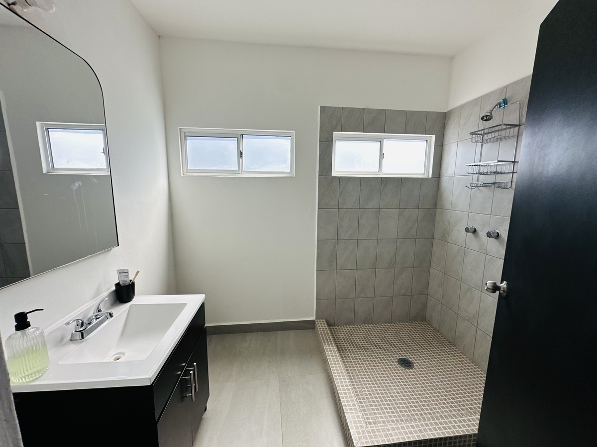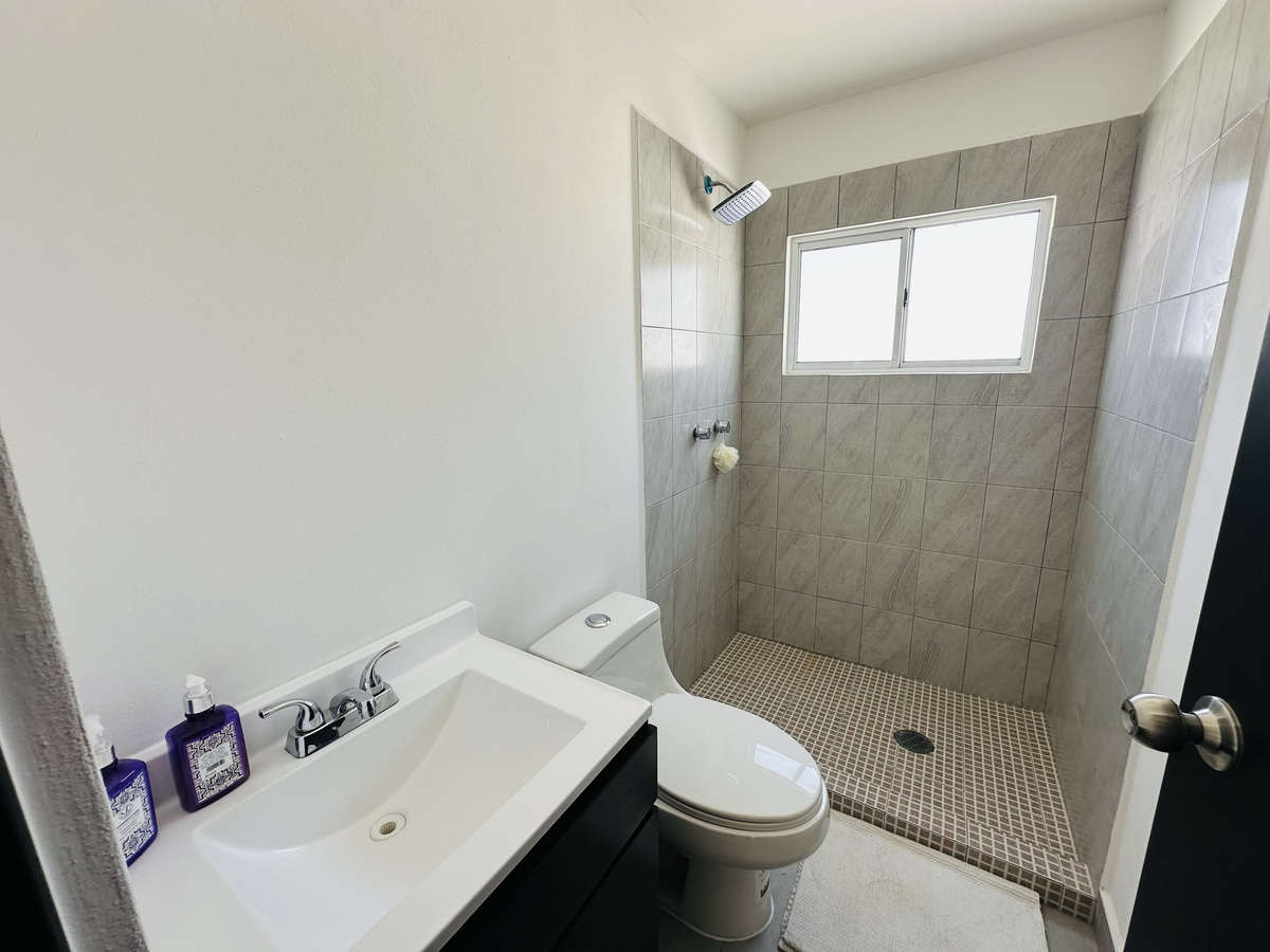 • Baño completo No. 1 con regadera, sanitario y mueble con lavabo.