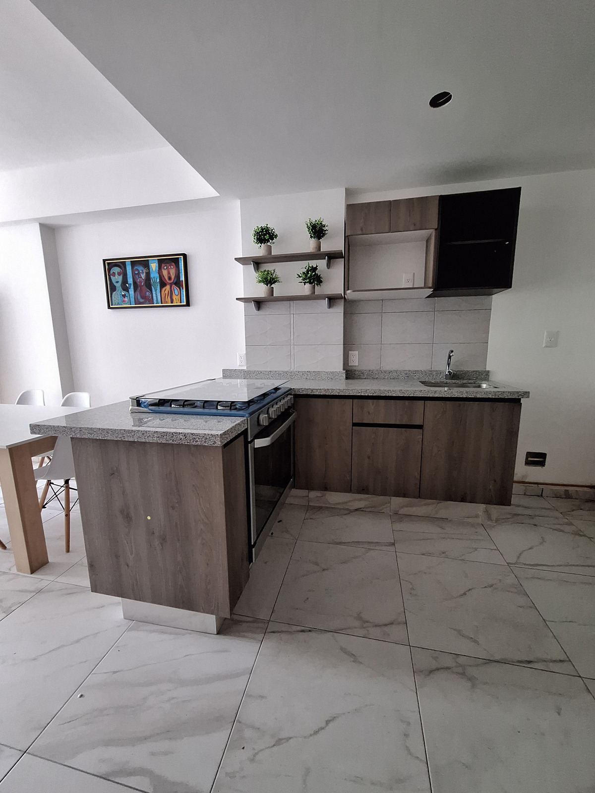 -Cocina equipada con barra desayunadora, pensada para reuniones familiares o comidas rápidas.