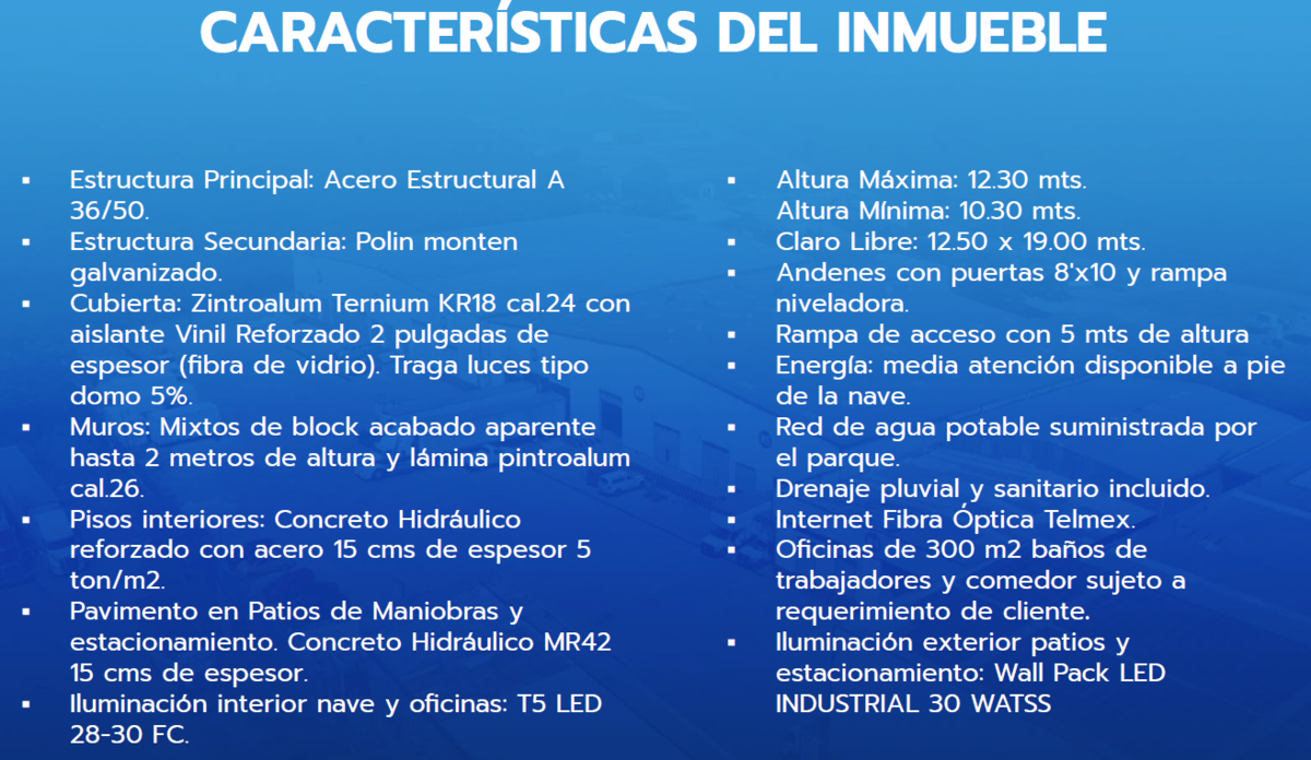 CARACTERÍSTICAS DE NAVE INDUSTRIAL 8,000 m2: