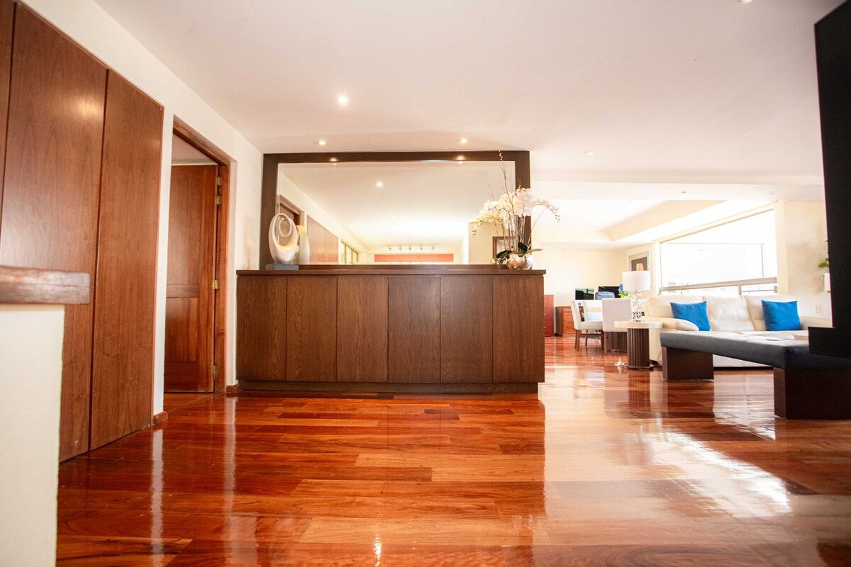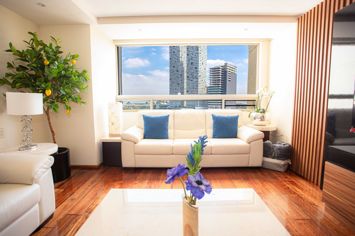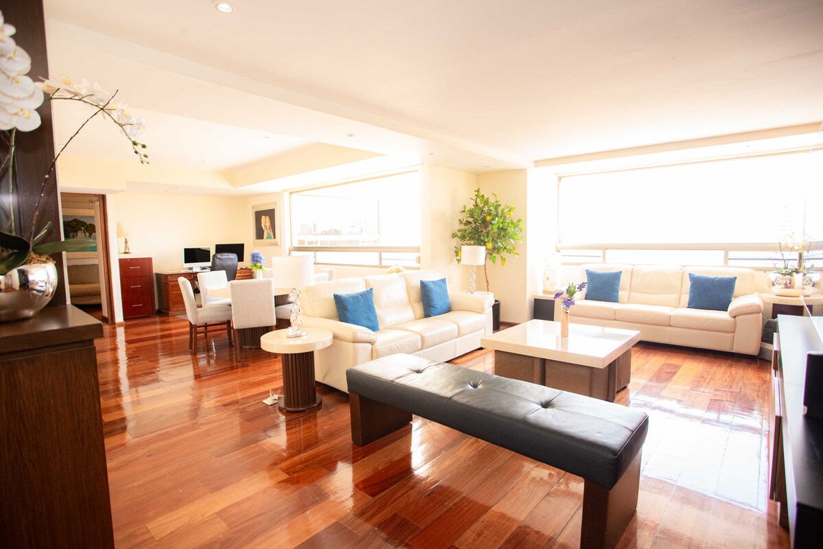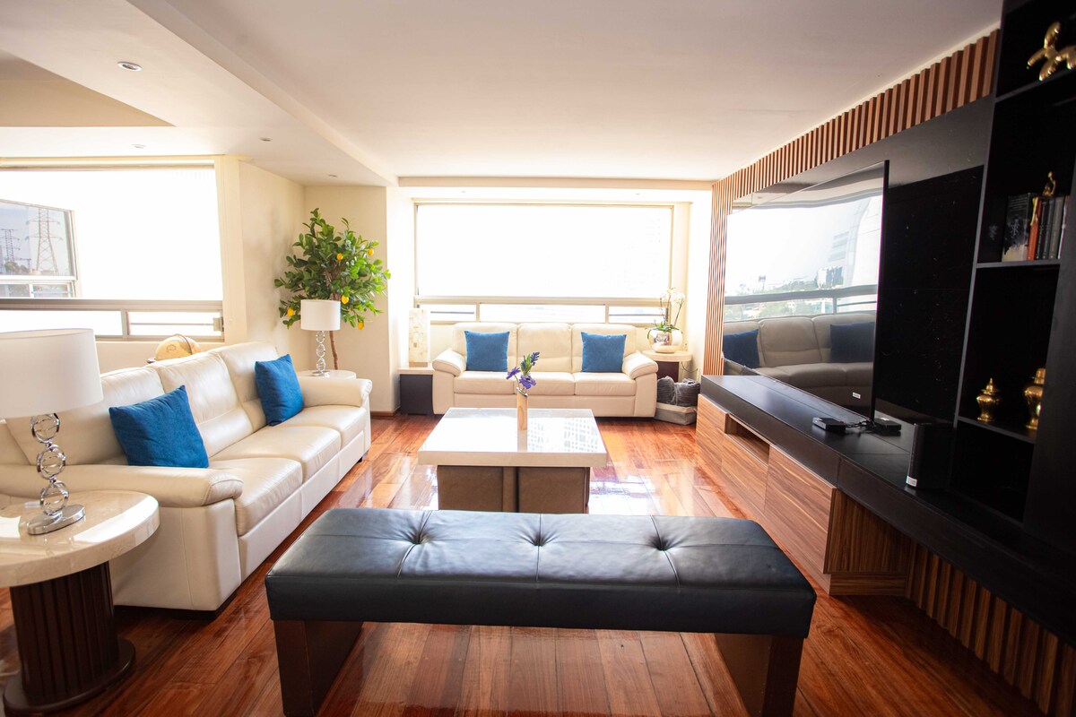 For privacy notice, complaints, and suggestions, please visit our website.Departamento con vistas espectaculares , muy iluminado y temperatura agradable. Cuenta con Mármol y madera en pisos, En la primer planta encontramos un lobby muy bonito, una sala y una gran terraza, ambos a doble altura y comedor para 14-16 personas todo con vistas impresionantes. Ademas cuenta con Cocina equipada con cubiertas de granito, un Family bastante grande, lavandera y cuarto de servicio, bodegas. En la segunda planta cuenta con área de closet de blancos, recibidor, un amplio Family con área de computadoras/ espacio para Home office y baño completo. Así como 2 muy grandes recamaras (suite) con vestidor y baño y una tercer recamara amplia, con vestidor y baño.