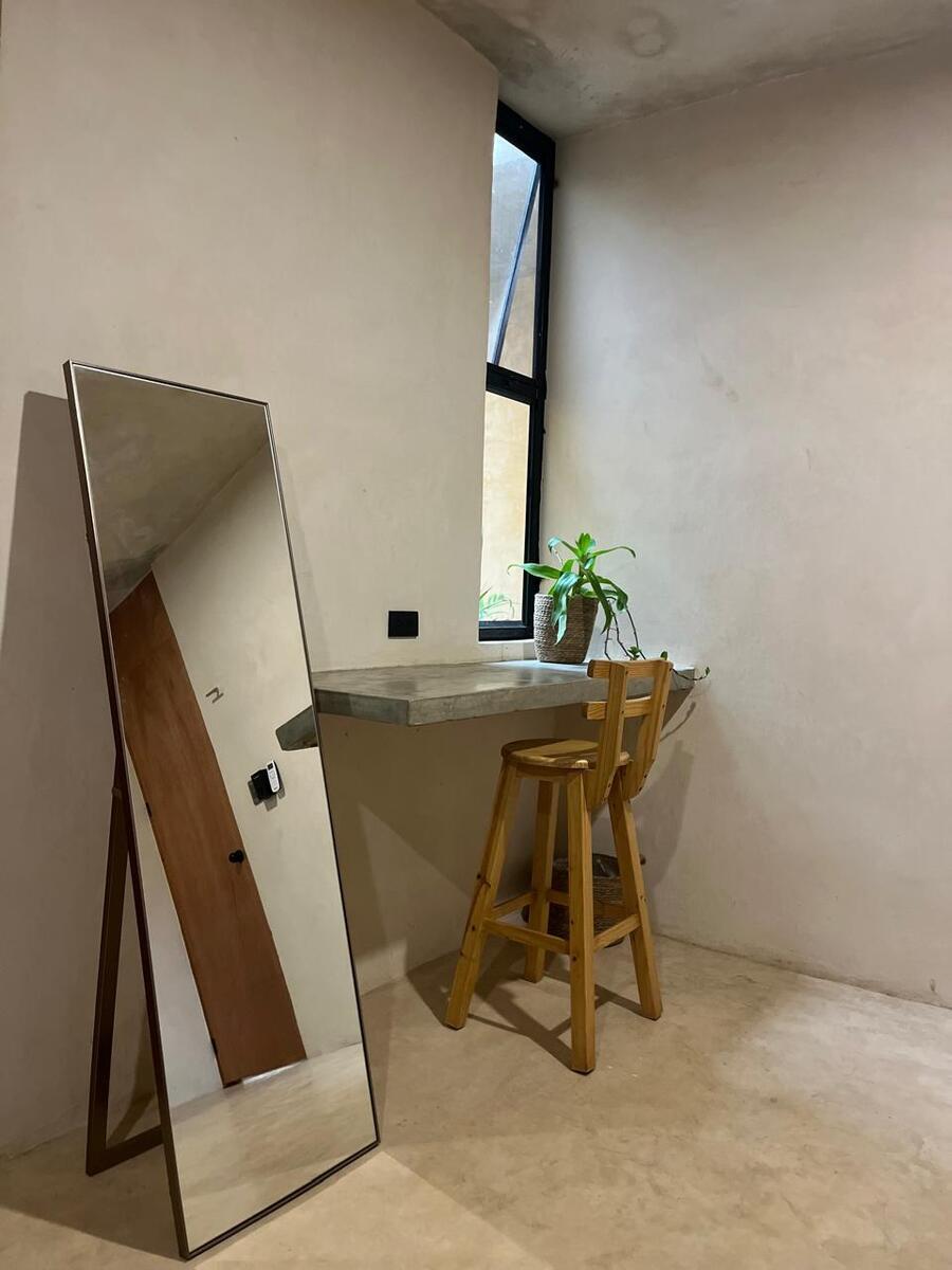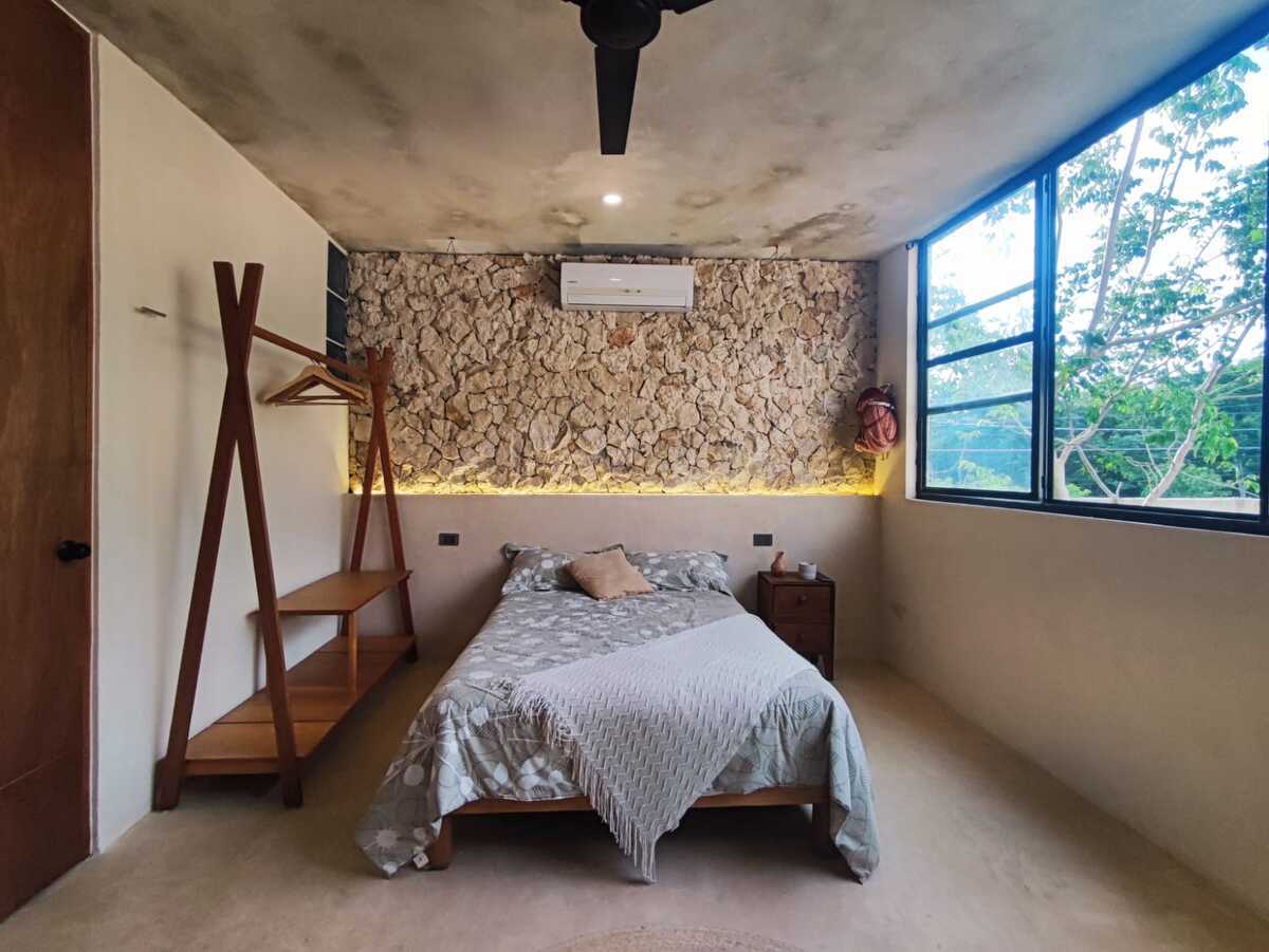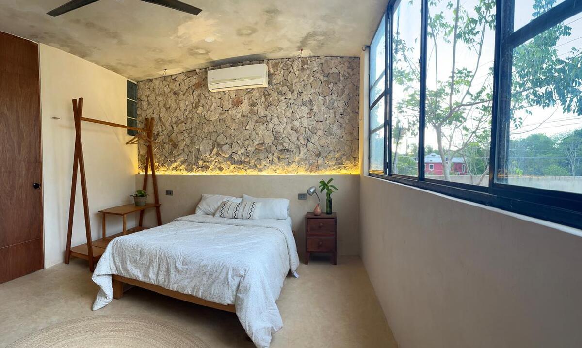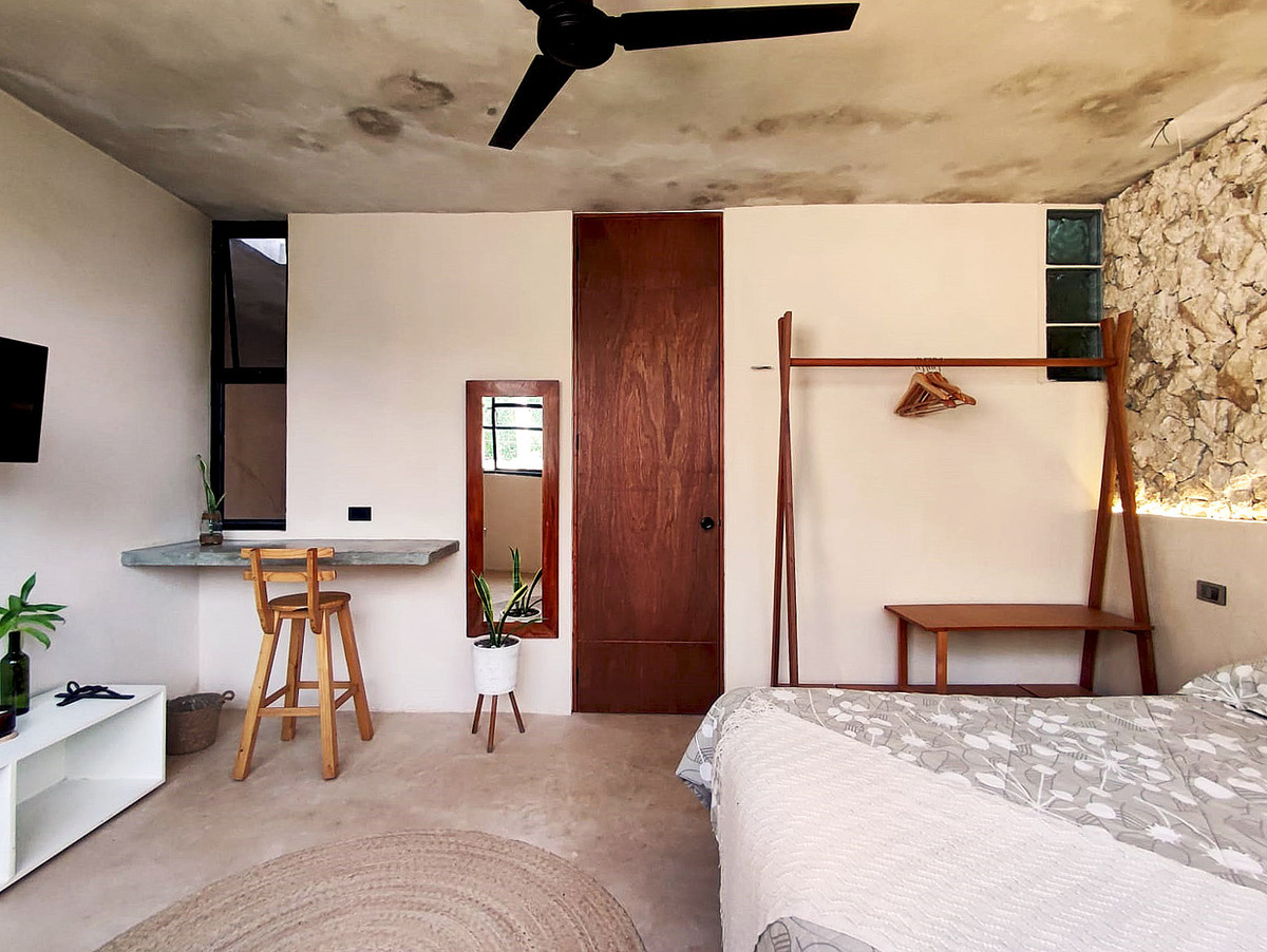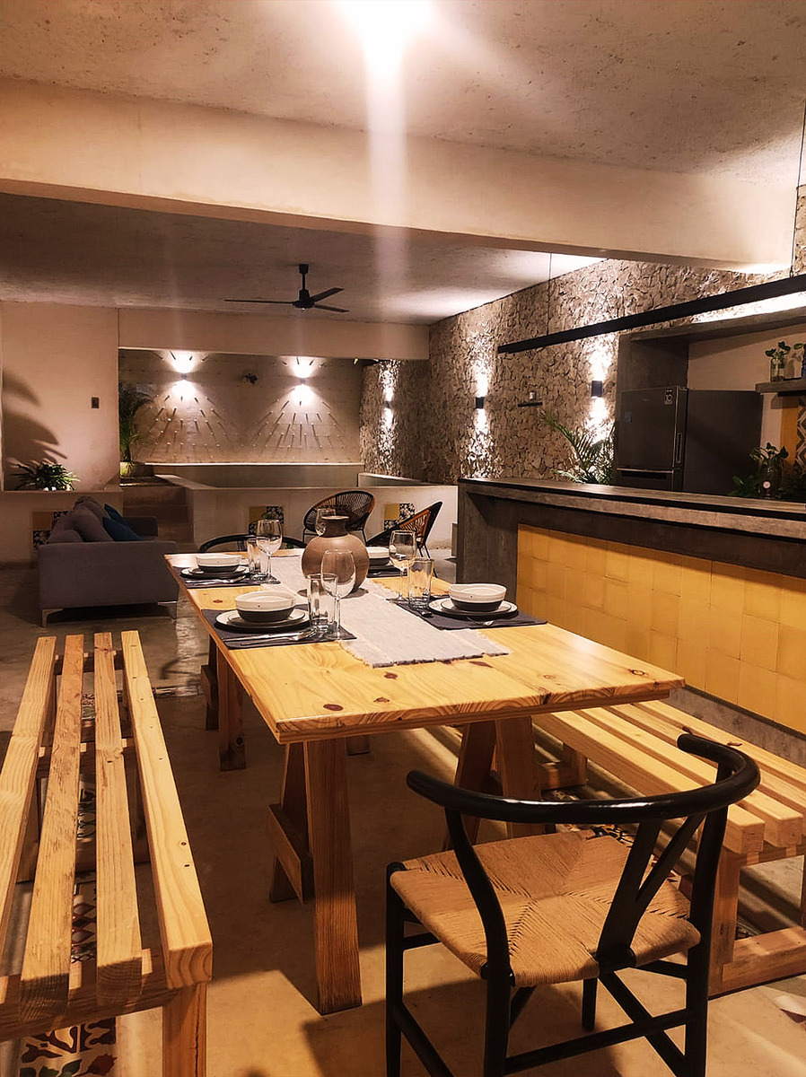 Finishes in chukum, regional stone, polished cement, and handmade pasta tiles.