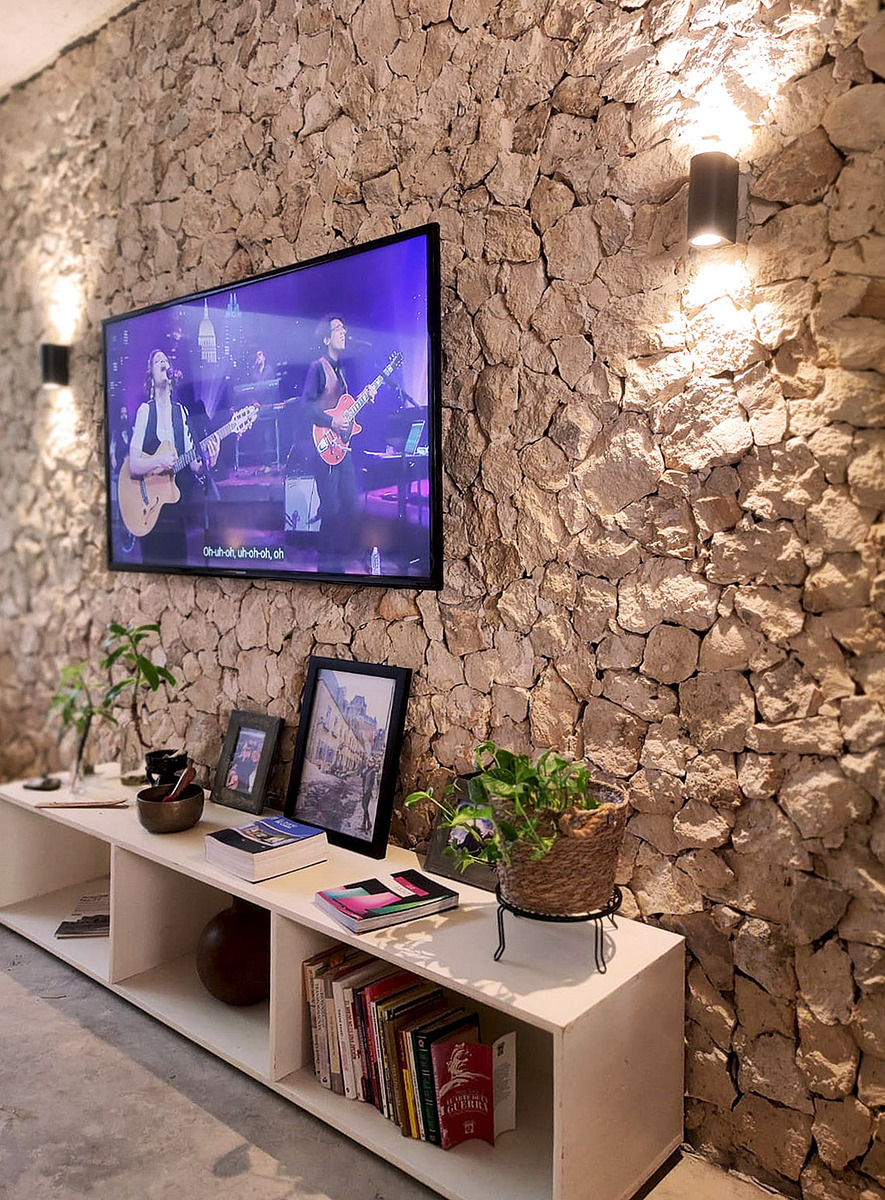 Finishes in chukum, pasta tiles, kimikolor stucco, and a decorative stone wall with LED lighting.