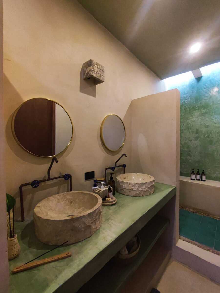 Con acabados en chukum, mosaicos de pasta, estuco kimikolor, y muro con acabado en piedra decorativa, con iluminación led, lavabos esculpidos con piedra de la región.
