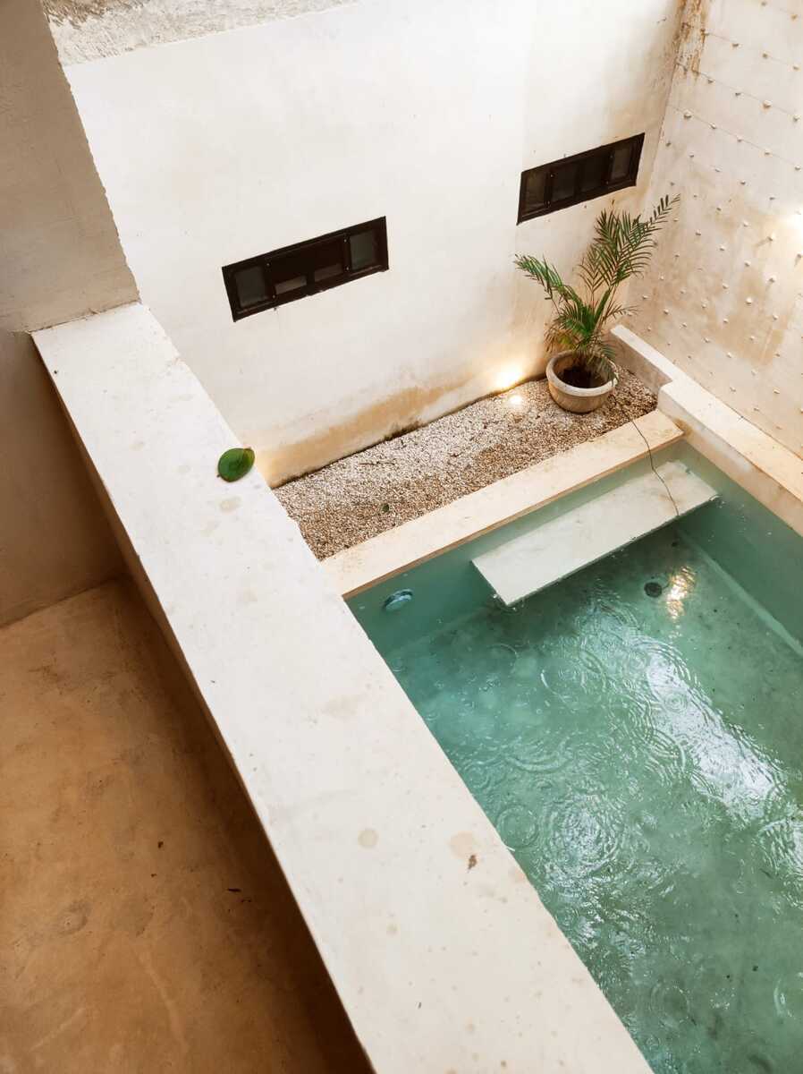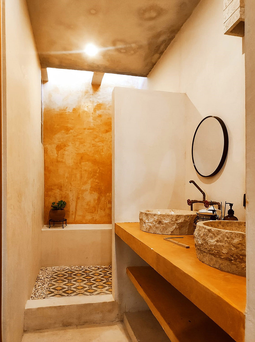 Finishes in chukum, pasta tiles, kimikolor stucco, and carved stone sinks made from local materials.