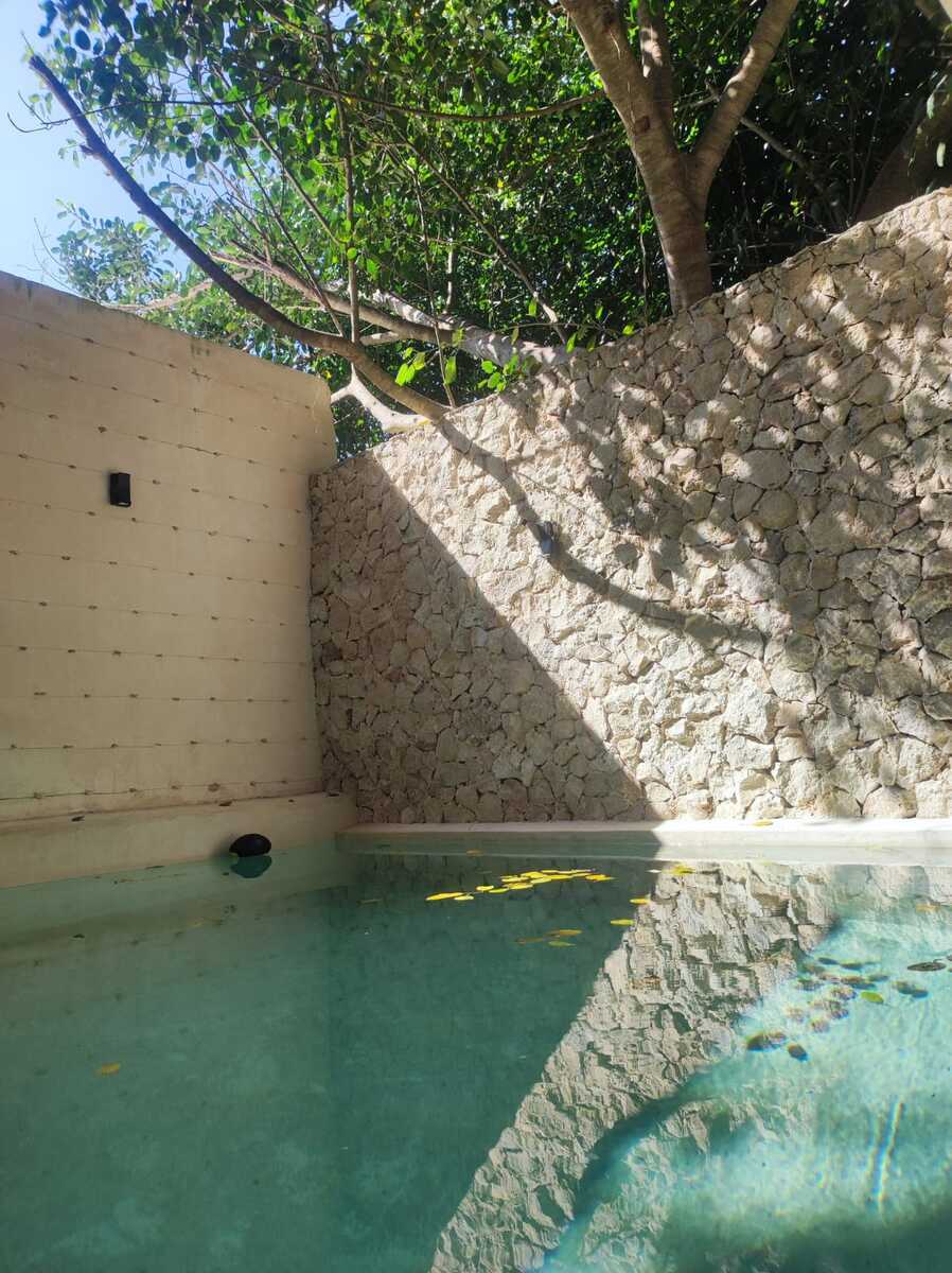 🏊♀️ Alberca con iluminación y acabado de chukum, y bancos, ideal para relajarse.